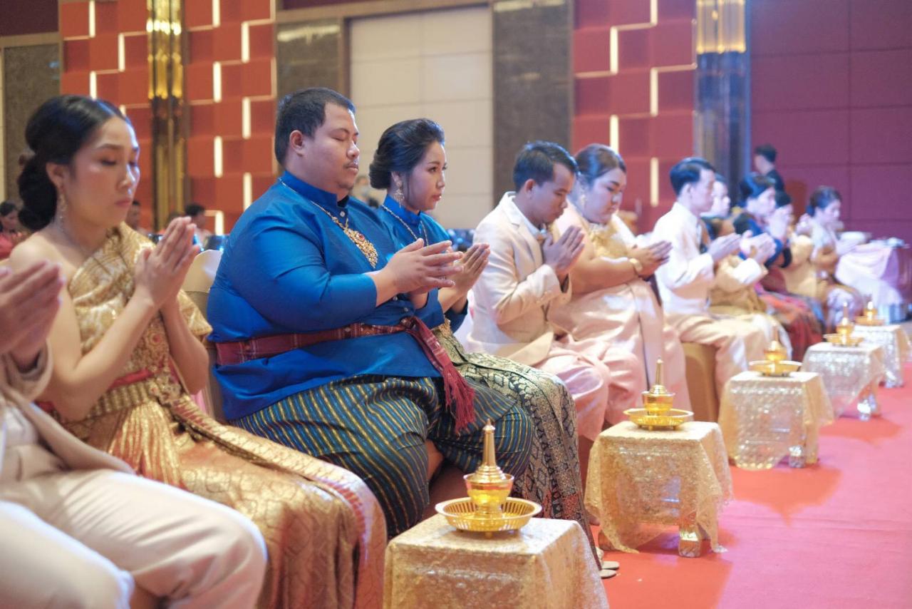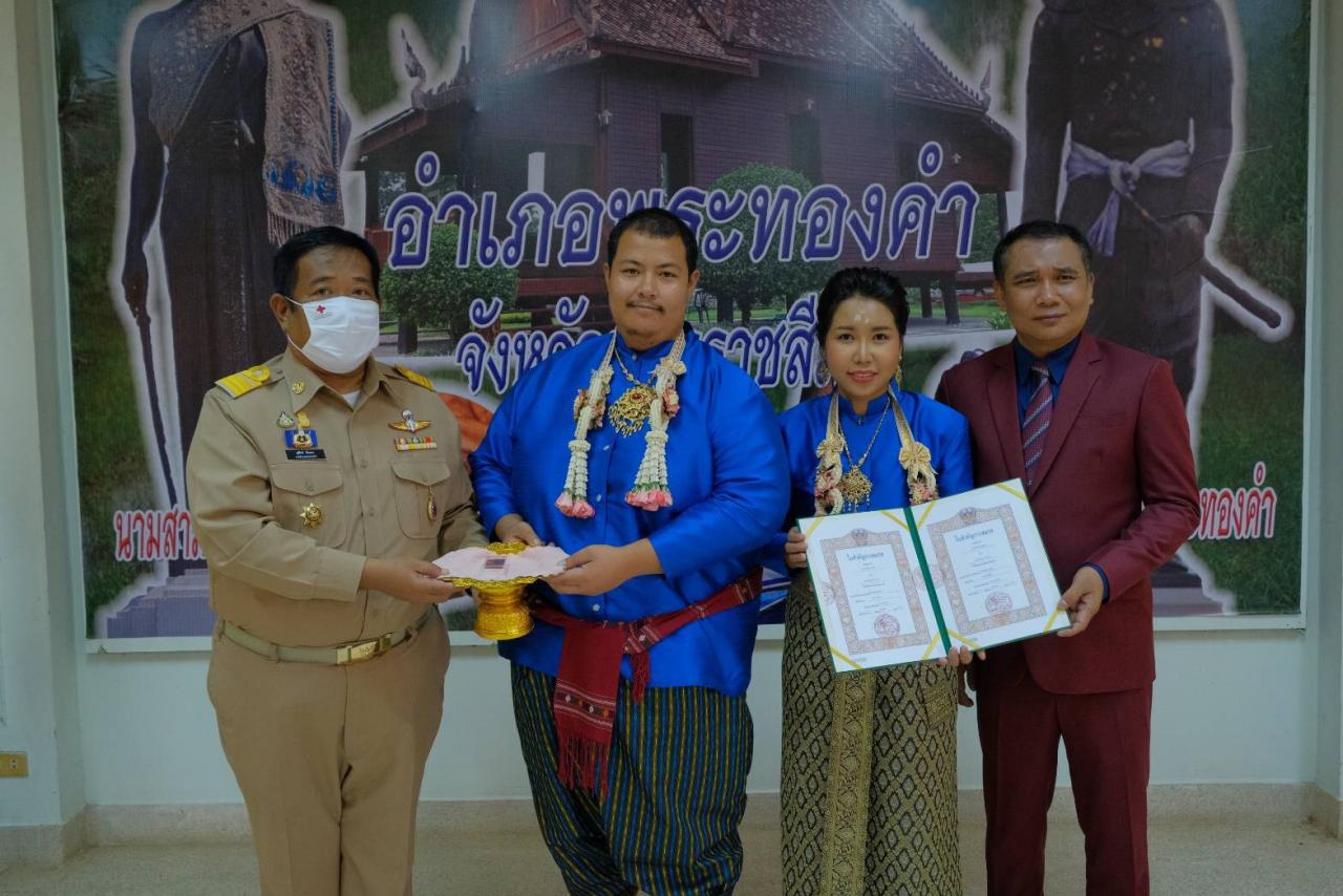 สำหรับบรรยากาศภายในงานชื่นมื่น มีหน่วยงานภาครัฐ เอกชน แขกเหรื่อ ญาติคู่บ่าวสาว ร่วมเป็นสักขีพยานล้นหลาม เริ่มตั้งแต่พิธีทำบุญตักบาตร ขบวนแห่ขันหมาก มีการโห่ร้อง ตีกลองยาว อย่างสนุกสนาน ก่อนจะจดทะเบียนสมรสอย่างเป็นทางการ ที่ทางอำเภอ พระทองคำ ยกมาให้บริการถึงโรงแรมหรู ก่อนจะเข้าสู่พิธีรดน้ำสังข์ และส่งมอบเงินขวัญถุงให้ทุกคู่ จากนั้นจึงส่งตัวเข้าห้องหอ ในห้องพักสวยหรูในโรงแรม สร้างฝันคู่บ่าวสาวให้เป็นจริง