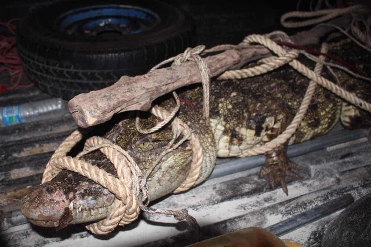 เมื่อกู้ภัยเดินทางมาถึง พบจระเข้ตัวใหญ่ ยาวเกือบ 2 เมตร น้ำหนักประมาณ 80 กิโลกรัม นอนอ้าปากอยู่ใต้เตียงไม้ ข้างบ้านนายกร จึงใช้อุปกรณ์เข้าไปเพื่อจับ แต่จระเข้ตื่นแสงไฟวิ่งหนีลงบ่อเลี้ยงปลาข้างบ้าน ทีมกู้ภัยต้องใช้อุปกรณ์ตาข่ายเชือก ล้อมจับจระเข้ได้สำเร็จ