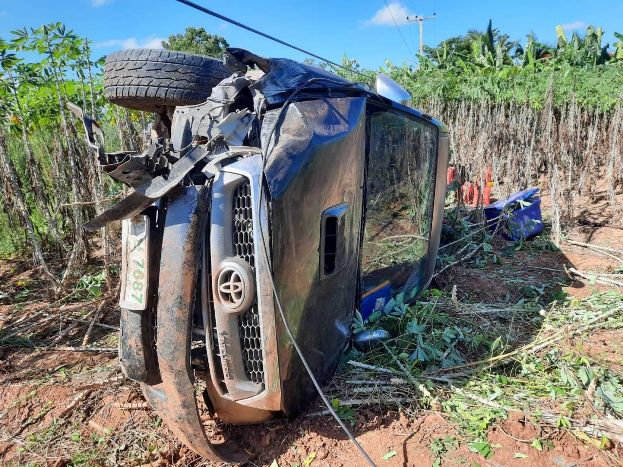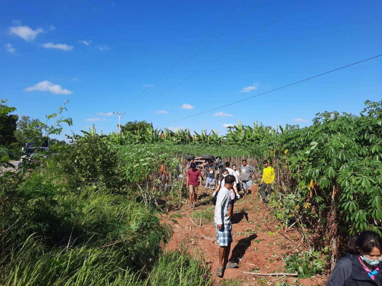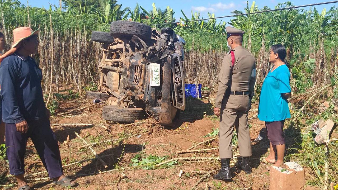 ห่างจากจุดเกิดเหตุประมาณ 60 เมตร กลางไร่มันสำปะหลังที่ล้มราบเป็นทางยาว พบรถกระบะโตโยต้า วีโก้ สีดำ ทะเบียน บษ 7687 สุราษฎร์ธานี สภาพมีรอยกระแทกกับเสาไฟฟ้า จนเสาไฟหักลงมา 1 ต้น พลิกคว่ำตะแคงซ้าย พังยับ มีนางประภาศรี ทองสุข อายุ 35 ปี ชาวบ้าน หมู่ 16 ต.ด่านขุนทด อ.ด่านขุนทด จ.นครราชสีมา เป็นคนขับ ได้รับบาดเจ็บสาหัส หน่วยกู้ชีพ รพ.ด่านขุนทด นำตัวส่งไปรักษาที่ รพ.ด่านขุนทด ส่วนศพผู้ตาย ให้หน่วยกู้ภัยปริสุทฺโธ (ฮุก31 จุดด่านขุนทด) นำส่งชันสูตรพลิกศพที่ รพ.ด่านขุนทด เช่นกัน