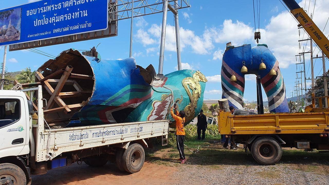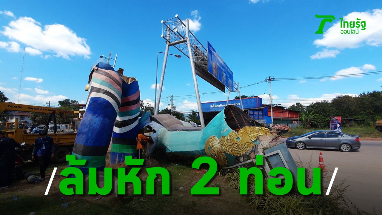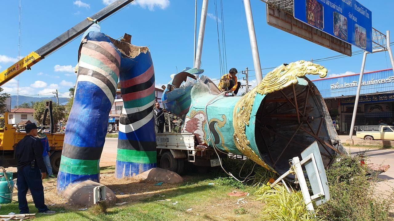 สุดเศร้ารูปผีตาโขน อ.ด่านซ้าย หมดอายุขัยตามน้องไดโนขอนแก่น เจอพายุลมพัดหักสองท่อน สร้างความเศร้าใจกับชาวบ้านและนักท่องเที่ยวที่ผ่านไปมา หลังอยู่เป็นสัญลักษณ์ให้จังหวัดเลยอย่างแข็งขันมาหลายปี