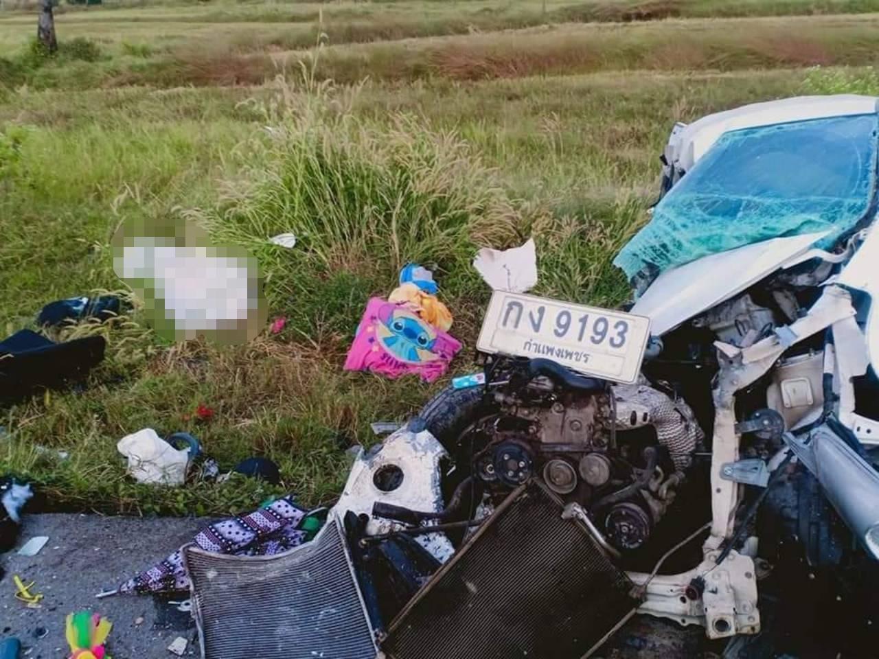 ที่เกิดเหตุพบรถกระบะ อีซูซุ สีขาว หมายเลขทะเบียน 2 ฒย 7921 กรุงเทพมหานคร ซึ่งเป็นรถบรรทุกลูกชิ้น ชนประสานงานกับรถเก๋งโตโยต้า (รถแวน) สีขาว หมายเลขทะเบียน กง 9193 กำแพงเพชร สภาพรถเก๋งพังยับเยิน ตกลงไปกลางทุ่งนา ผู้โดยสารซึ่งเป็นเด็กและผู้ใหญ่กระเด็นออกมาตายเกลื่อนทั้งหมด 5 ราย เป็นหญิง 4 ราย เป็นชาย 1 ราย และยังมีผู้ได้รับบาดเจ็บอีก 4 ราย ทางเจ้าหน้าที่หน่วยกู้ชีพจึงได้นำตัวผู้ได้รับบาดเจ็บทั้งหมดลำเลียงส่ง โรงพยาบาลคง โรงพยาบาลสีดา และ โรงพยาบาลโนนแดง