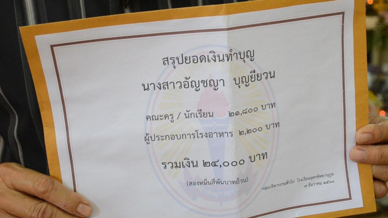 โดยนายคำสิงห์ กำลังจุดธูปบอกกล่าวดวงวิญญาณน้องอุ๋งอิ๋ง ขอบใจที่ดลใจให้พ่อไปพบซองสีน้ำตาล ซึ่งเป็นซองร่วมทำบุญของคณะครูและนักเรียนโรงเรียนอุดรพิทยานุกูล ซึ่งนำเงินมามอบให้ จำนวน 24,000 บาท เมื่อวันที่ 7 ธันวาคม ที่ผ่านมา ซึ่งได้วางซองไว้ข้างเงินใส่ซองผู้ที่มาร่วมทำบุญสวดอภิธรรมกับน้องอุ๋งอิ๋ง โดยกล่าวว่า “หนูดลใจพ่อมาให้เห็นซองเงินใช่ไหมลูก พ่อมีความทุกข์กับหนูแล้ว หนูเลยมาให้โชคพ่อ มาดลใจให้พ่อมาเปิดดูซองเงิน ทั้งที่พ่อจะนำไปทิ้งแล้ว ขอให้ไปเกิดเป็นนางฟ้าบนสวรรค์นะ”