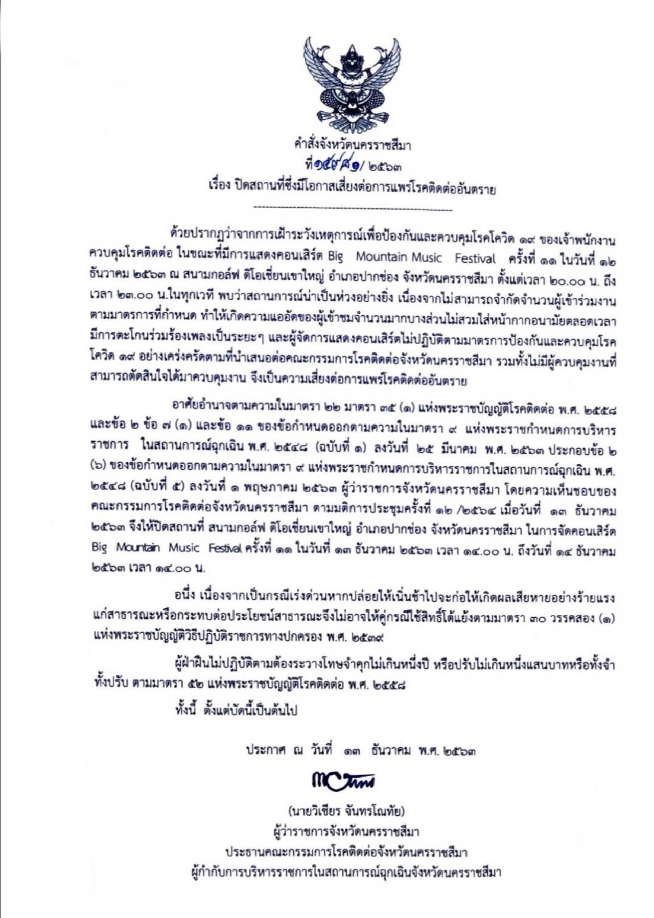 ผวจ.นครราชสีมา ลงนามในคำสั่ง ปิดใช้สถานที่จัดการแสดงคอนเสิร์ต Big Mountain Music Festival เร่งด่วน วันนี้ (13 ธ.ค.) หลังพบน่าเป็นห่วง คนแออัด ไม่มีมาตรการป้องกันโควิด ปล่อยไว้อาจเสียหายร้ายแรง