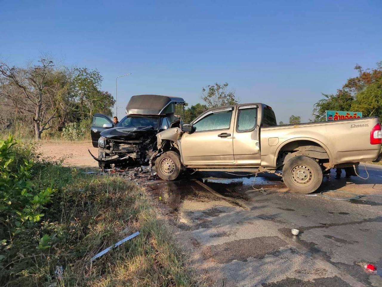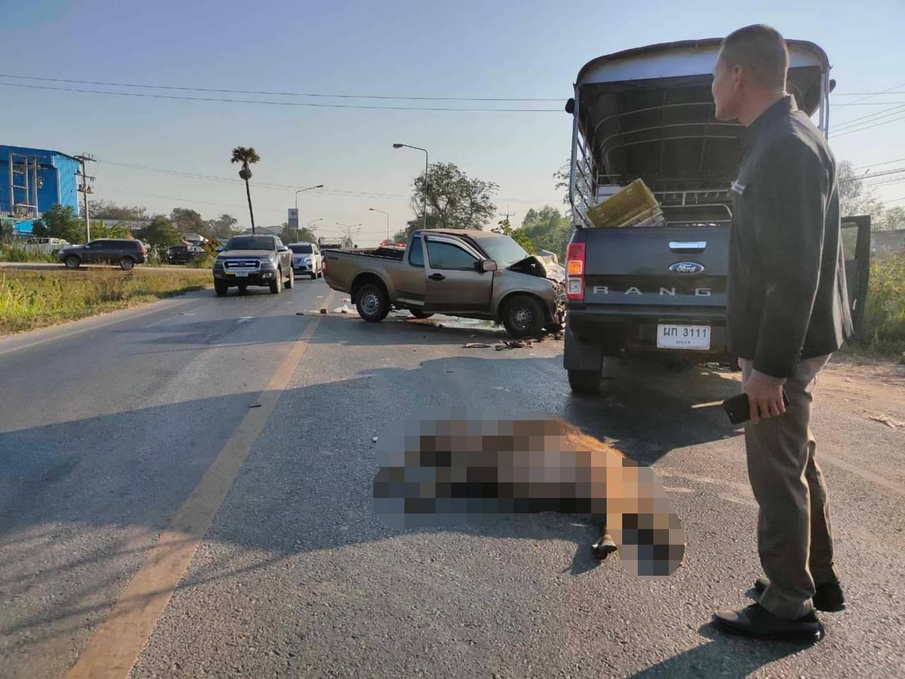 ห่างจากซากควายไปประมาณ 10 เมตร พบรถยนต์กระบะ ยี่ห้อฟอร์ด รุ่นเรนเจอร์ สีเทา ทะเบียน ผก-3111 ระยอง จอดอยู่ในสภาพหน้ารถพังยับเยิน มีนายสุรชัย จูช้าง อายุ 54 ปี ชาวบ้าน ม.8 ต.ท่ามะไฟ อ.แก้งคร้อ จ.ชัยภูมิ เป็นคนขับ ได้รับบาดเจ็บเพียงเล็กน้อย ใกล้ๆ กันพบรถกระบะ ยี่ห้ออีซูซุ สีบรอนซ์ทอง ทะเบียน บร-1274 ขอนแก่น จอดอยู่ในสภาพหน้ารถพังยับเยินเช่นกัน มีนายสมพงษ์ บุศีรคำ อายุ 53 ปี อยู่บ้านเลขที่ 61 ม.4 ต.บ้านขาม อ.น้ำพอง จ.ขอนแก่น เป็นคนขับ และมีนางญวนใจ ชนะสะแบง อายุ 54 ปี นั่งคู่มาที่เบาะหน้า ได้รับบาดเจ็บทั้งคู่ เจ้าหน้าที่กู้ชีพนำส่งที่ รพ.มัญจาคีรี เป็นการด่วน