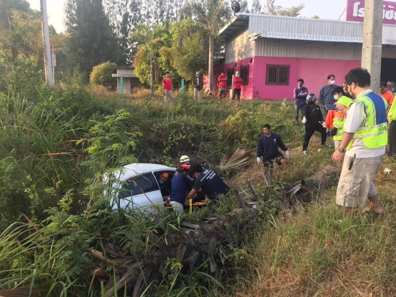 และห่างออกไปราว 500 เมตร ยังพบรถเก๋งยี่ห้อฮอนด้า ซิตี้ สีขาว ป้ายทะเบียน ฆอ 6058 หมวดจังหวัดกรุงเทพมหานคร เสียหลักชนรถแบ็กโฮที่จอดอยู่ข้างทาง สภาพด้านหน้าและด้านหลังพังยับเยิน ส่วนคนขับเจ้าหน้าที่นำตัวส่งโรงพยาบาลไปก่อนแล้วเช่นกัน