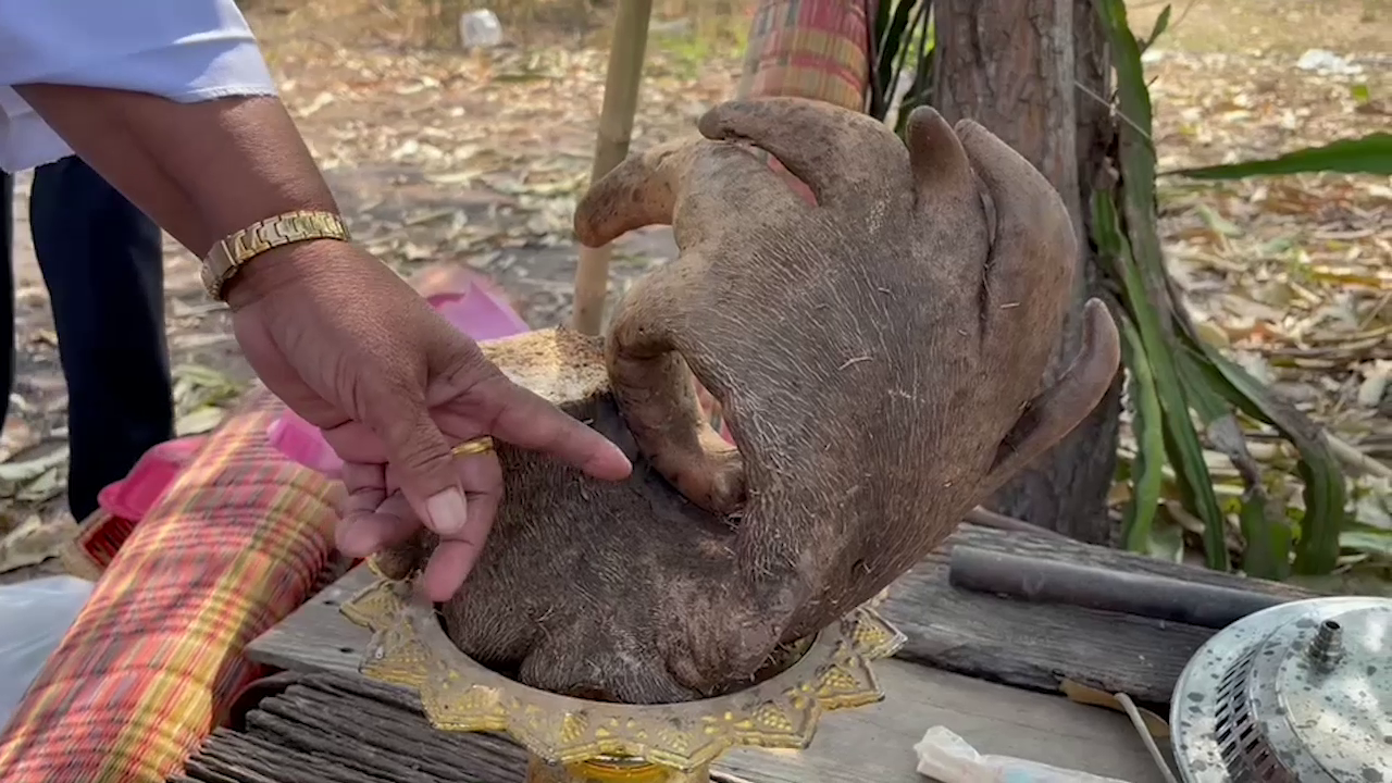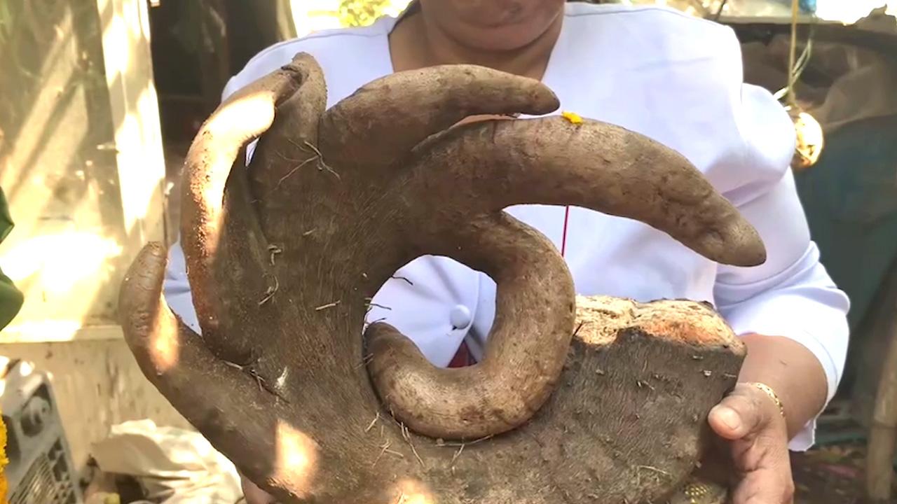โดยในพิธี ทางเจ้าภาพได้นำหัวมันไม่ทราบพันธุ์ น้ำหนักประมาณ 3 กก. มาตั้งรวมกับเครื่องเซ่นไหว้ ซึ่งหัวมันดังกล่าวเป็นหัวมันที่ชาวบ้านปลูกไว้กิน คล้ายมันมือเสือ แต่หัวนี้มีลักษณะประหลาด มีรูปร่างคล้ายมือมนุษย์ มีนิ้วรวม 6 นิ้ว ในลักษณะ "โอเค"