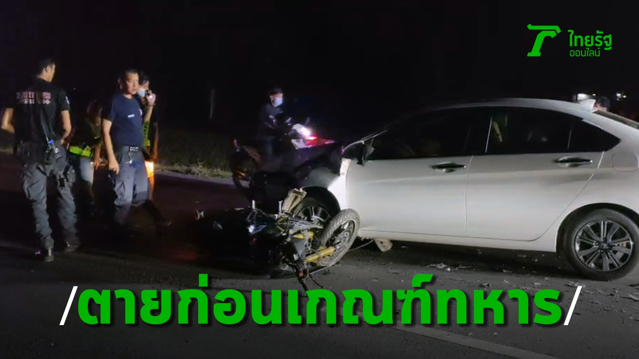ว่าที่บ่าวสาวขับเก๋งชน จยย.ย้อนศรโจ๋วัย 21 ลอยกระเด็นตกกลางถนนรถยนต์ตามหลังเหยียบซ้ำดับอนาถ โดยผู้ตายตั้งใจจะไปเกณฑ์ทหารในวันพรุ่งนี้แต่ต้องมีเสียชีวิตเสียก่อน