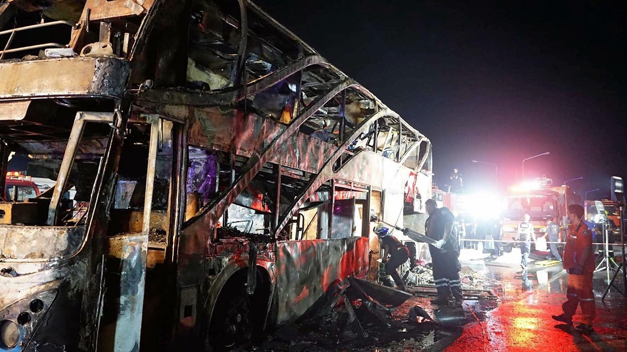 สภาพรถทัวร์โดยสาร สองชั้น สายบึงกาฬ-กรุงเทพฯ ของบริษัท 407 พัฒนาทัวร์ จำกัด ถูกไฟ ไหม้วอดทั้งคัน บนถนน มิตรภาพ บ้านหนองขาม ต.โนนสมบูรณ์ อ.บ้านแฮด จ.ขอนแก่น ย่างสดผู้โดยสารเสียชีวิต 5 ศพ