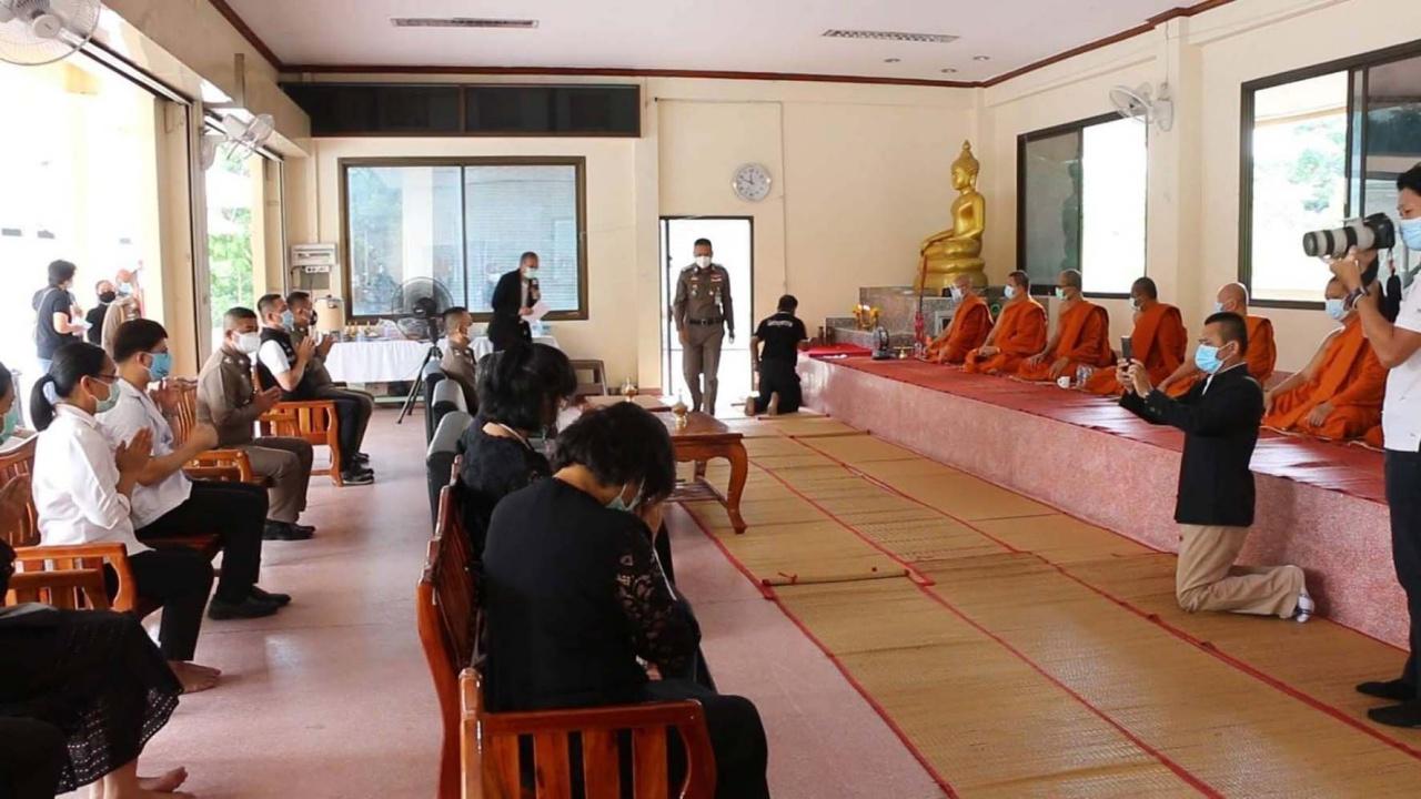 โดยเมื่อรถพยาบาล รพ.ขอนแก่นมาถึง ได้ตรงไปที่เมรุ 3 ของวัดก่อนที่เจ้าหน้าที่ประจำ รพ.ได้เคลื่อนศพผู้เสียชีวิตเข้าเมรุทันที โดยทุกคนได้สวมใส่ชุดพีพีอีเพื่อป้องกันการติดเชื้อ ตามแนวทางการปฏิบัติของกระทรวงสาธารณสุข โดยไม่อนุญาตให้ผู้ที่มีส่วนเกี่ยวข้องเข้าไปในพื้นที่ของเมรุโดยเด็ดขาด นอกจากนั้นพระสงฆ์ได้ประกอบพิธีสวดบังสุกุลศพ ที่ศาลาสรนาถธรรมจารย์ โดยมีคนในครอบครัว รวมทั้ง ผู้บังคับบัญชาและข้าราชการตำรวจ ร่วมในการประกอบพิธีไม่มากนัก โดยทุกคนต้องเข้ารับการตรวจคัดกรอง มีการตรวจวัดอุณหภูมิร่างกาย ลงทะเบียนผ่านแอปพลิเคชันไทยชนะของทางวัด และทำความสะอาดมือด้วยเจลแอลกอฮอล์ ตามมาตรฐานความปลอดภัยด้านสาธารณสุขอย่างเข้มงวด