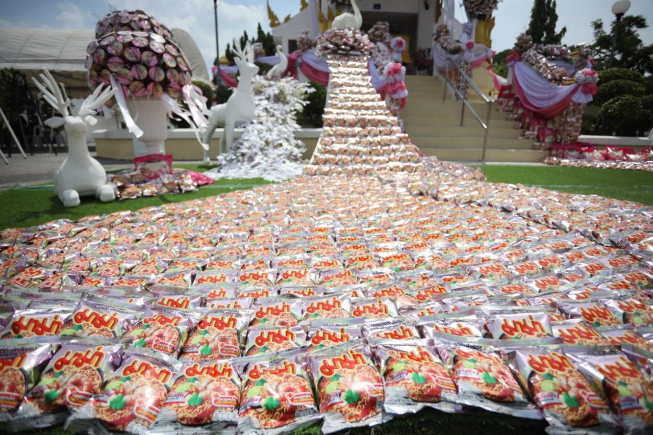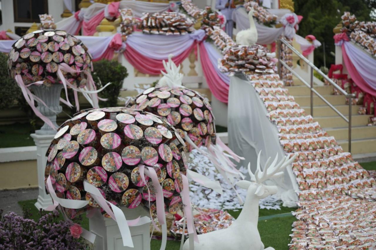 พันตำรวจเอกคเชนท์ เสตะปุตตะ ผู้กำกับการ สภ.จอหอ จังหวัดนครราชสีมา บุตรชายผู้เสียชีวิต เปิดเผยว่า มารดาของตนมีนิสัยชอบช่วยเหลือผู้ด้อยโอกาส และทำบุญอยู่เป็นประจำ หลังจากมารดาได้เสียชีวิต ครอบครัวจึงมีไอเดียจัดเมรุปันสุข นำอาหารแห้งมาใช้แทนดอกไม้ตกแต่งงานศพ โดยประสานร้านตุ๊กดอกไม้ ตลาดใหม่แม่กิมเฮง มาดำเนินการประดับตกแต่งเมรุโดยใช้ซองบะหมี่กึ่งสำเร็จรูป จำนวน 2,000 ซอง บะหมี่กึ่งสำเร็จรูปแบบถ้วย 600 ถ้วย และข้าวสารบรรจุ 5 กิโลกรัม จำนวน 80 ถุง โดยหลังจากเสร็จงานศพครอบครัวตั้งใจนำบะหมี่กึ่งสำเร็จรูปและถุงข้าวสารทั้งหมด ไปมอบให้ประชาชนผู้ที่เดือดร้อน และกำลังประสบปัญหาจากสถานการณ์การแพร่ระบาดของโควิด-19 ต่อไป.