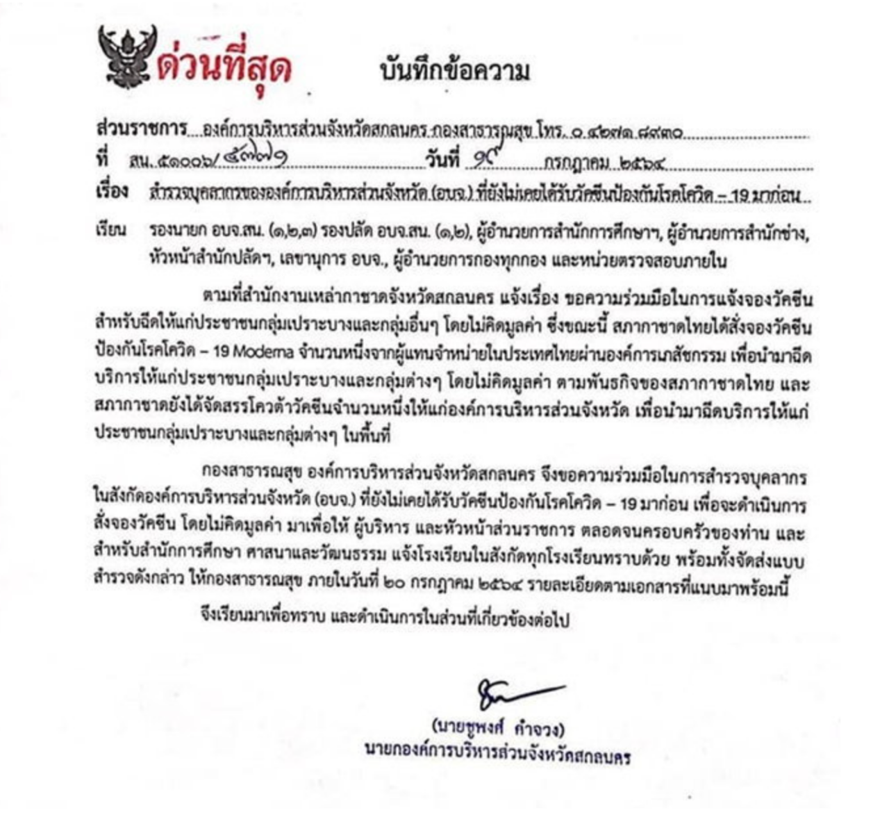 จากกรณี โลกออนไลน์ มีการแชร์ภาพหนังสือราชการ ที่อ้างว่า เป็นขององค์การบริหารส่วนจังหวัดสกลนคร เรื่อง สำรวจบุคลากรขององค์การบริหารส่วนจังหวัดสกลนคร ที่ยังไม่เคยได้รับวัคซีนป้องกันโรคโควิด-19 มาก่อน ใจความสำคัญ คือ การสำรวจบุคลากรใน อบจ. เพื่อจะดำเนินการสั่งจองวัคซีนโมเดอร์นา โดยไม่คิดมูลค่า เพื่อให้ผู้บริหารและหัวหน้าส่วนราชการ ตลอดจนครอบครัวของบุคลากรในสังกัด อบจ.สกลนคร และโรงเรียนในสังกัด อบจ.สกลนคร