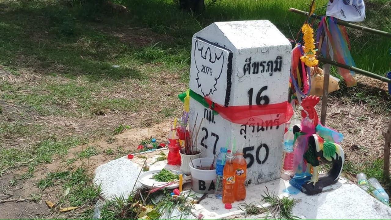หลักกิโลเมตรที่ 27 ถนนศีขรภูมิ-รัตนบุรี จ.สุรินทร์ ลือกันนักลือกันหนาว่า เฮี้ยน ชาวบ้านนำของมาเซ่นไหว้ มีทั้งเสื้อผ้าเครื่องนุ่งห่ม ดอกไม้ธูปเทียน อาหารคาวหวาน หลังถูกหวยติดต่อมาแล้ว 11 งวด