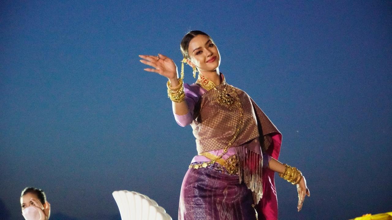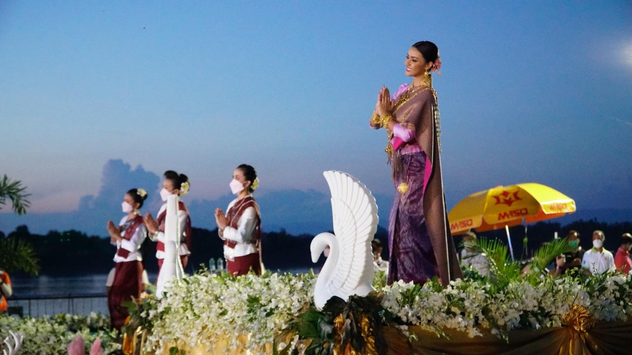 อแมนด้า ออบดัม มิสยูนิเวิร์สไทยแลนด์ รำบวงสรวงงานเทศกาลออกพรรษาบั้งไฟพญานาคที่โพนพิสัย หนองคาย นักท่องเที่ยวรอชมบั้งไฟคึกคักแต่ไม่หนาแน่น จนท.จำกัดเฉพาะผู้ที่ฉีดวัคซีนครบโดสแล้วเท่านั้น