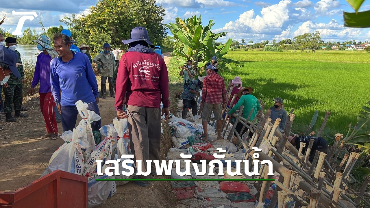 ชาวบ้านเร่งนำกระสอบทรายเสริมแนวพนังแม่น้ำชี หลังมีน้ำเซาะพนังทำดินสไลด์ หวั่นไหลเข้าท่วมหมู่บ้าน 143 หลังคาเรือน ไร่นาอีกกว่า 400 ไร่