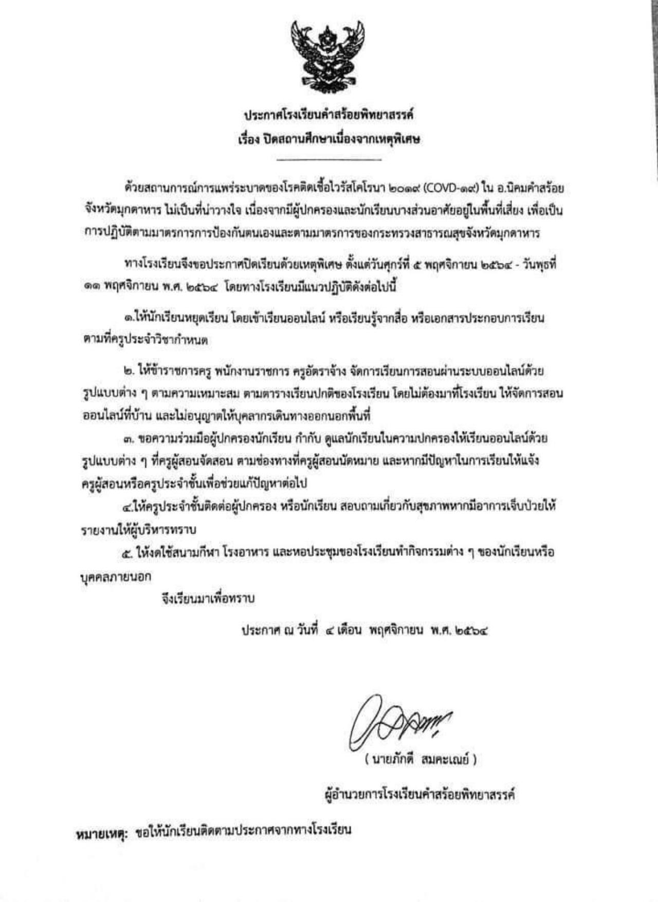 จากกรณีก่อนหน้ามีการประกาศพบคลัสเตอร์ โรงเรียนคำสร้อยพิทยาสรรค์ จ.มุกดาหาร ก่อนที่จะมีการยืนยัน ว่าผลการตรวจหาเชื้อด้วยวิธี RT-PCR นั้น ทั้งหมดไม่พบเชื้อ และทางโรงเรียนได้มีการสั่งปิดโรงเรียน ตั้งแต่วันที่ 5-15 พฤศจิกายน 64 ระหว่างนี้ให้มีการเรียนการสอนออนไลน์พร้อมกับให้ อสม.ประจำหมู่บ้าน ติดตามดูอาการของเด็กนักเรียนทุกครอบครัว ตามที่เสนอข่าวไปแล้วนั้น