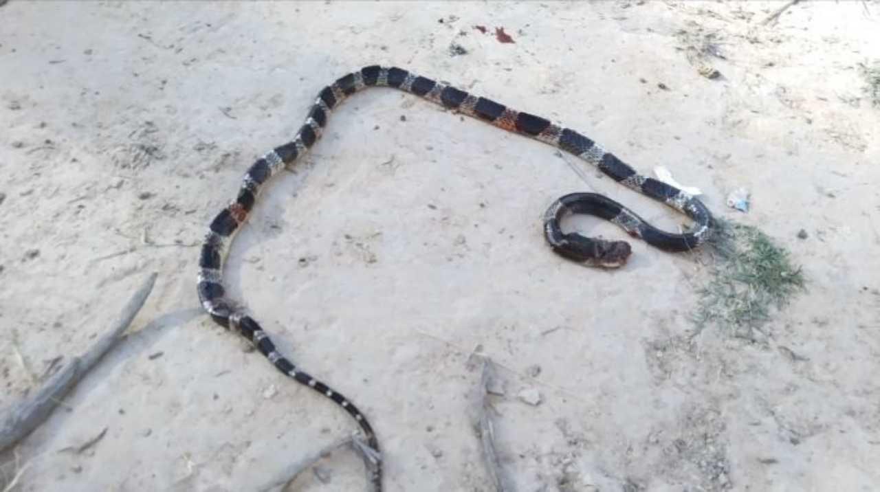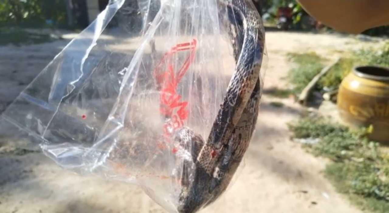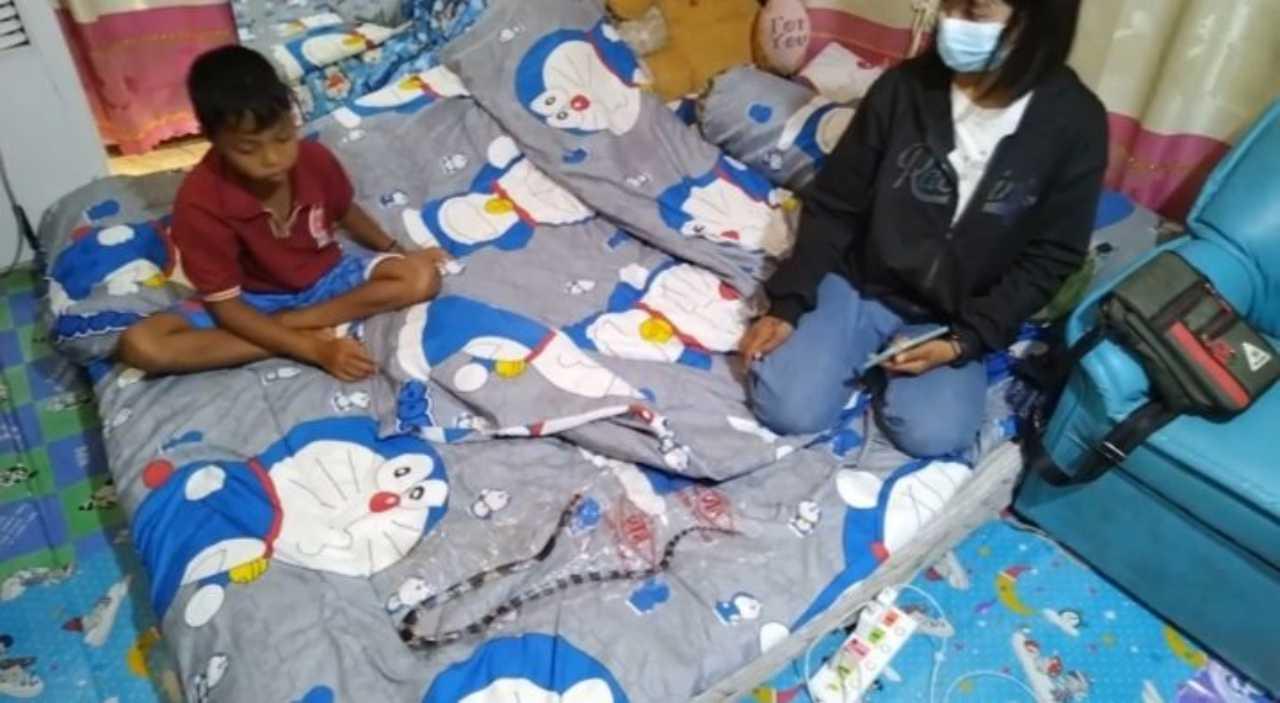 เมื่อวันที่ 19 พ.ย. 64 ที่บ้านโดนแบน บ้านเลขที่ 150 หมู่ 10 ต.นาดี อ.เมือง จ.สุรินทร์ ได้รับแจ้งจากนางสาวอุษา สำรวมจิตต์ (เสื้อแขนยาวสีดำ) อายุ 25 ปี ว่ามีงูทับสมิงคลาเข้ามาบนที่นอน มีลายเป็นปล้องสีขาวสลับกับสีดำ หางแหลม เลื้อยเข้ามาใต้ผ้าห่มบนที่นอน