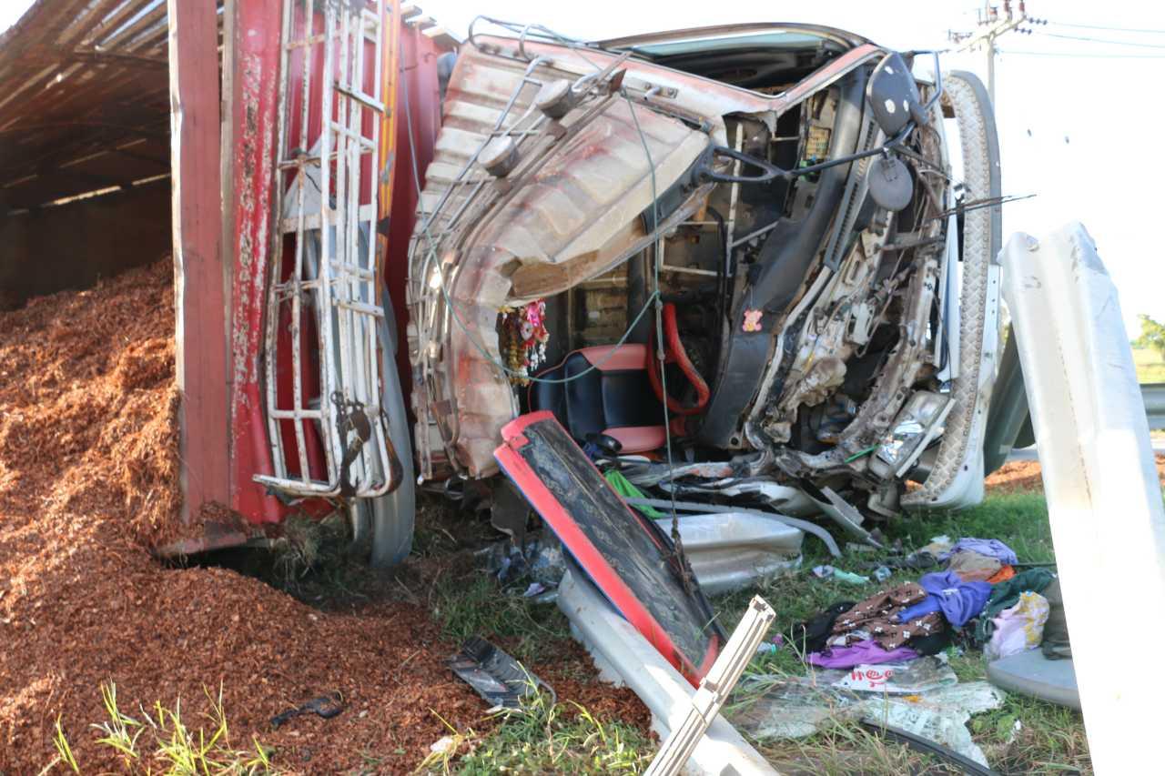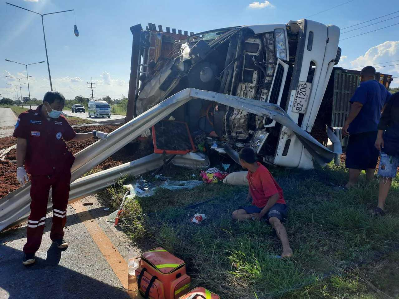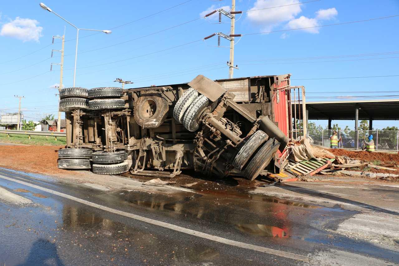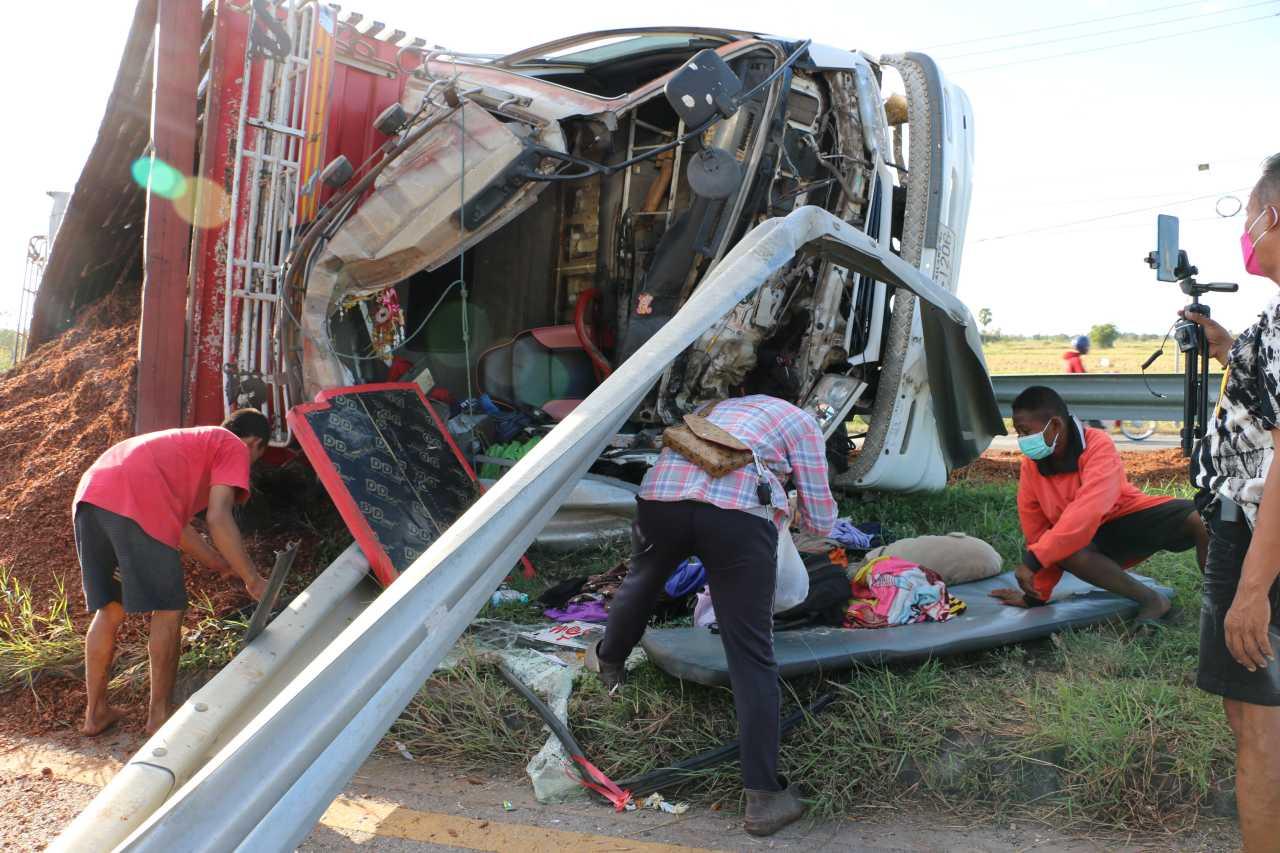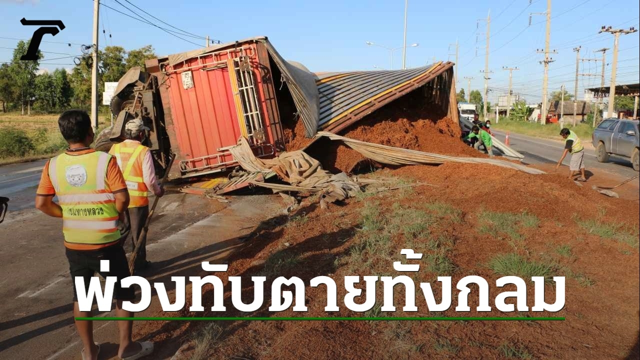 พ่วงสิบล้อเสียหลักพลิกคว่ำ บนถนนสีคิ้ว-ชัยภูมิ บริเวณบ้านห้วย อ.ด่านขุนทด ทับร่างเมียคนขับที่นั่งมาด้วยกันตายทั้งกลมคาที่ ด้านคนขับเผย ขับมาเจอเศษแป้งมันทำรถพ่วงลื่นจนพับติดพาตกถนนทั้งคัน
