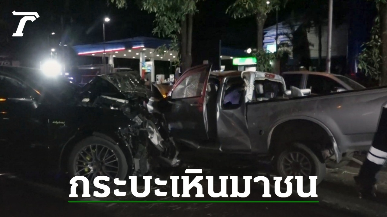 กระบะซิ่งเสียหลัก สะบัดตกร่องกลางถนน พุ่งไปชนปอร์เช่สวนทาง-หน้าอัดติดกันพังยับทั้งคู่ สลดคนกระบะดับคาที่ คนนั่งมาด้วยเจ็บหนัก 2 ส่วนปอร์เช่คนขับสาหัส-เมียนั่งข้างบาดเจ็บ
