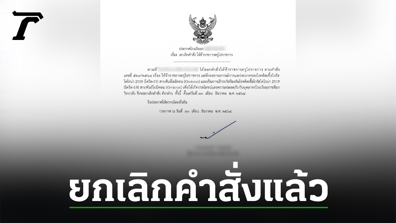 ล่าสุดเมื่อช่วงเย็นที่ผ่านมา (30 ธันวาคม 2564) นายประยงค์ ประทุมวัน ผู้อำนวยการโรงเรียนราชสีมาวิทยาลัย ได้ออกประกาศยกเลิกคำสั่งดังกล่าวแล้ว โดยได้ออกประกาศโรงเรียนราชสีมาวิทยาลัย เรื่อง ยกเลิกคำสั่ง ให้ข้าราชการครูไปราชการ โดยมีข้อความระบุว่า ตามที่โรงเรียนราชสีมาวิทยาลัย ได้ออกคำสั่งให้ข้าราชการครูไปราชการ ตามคำสั่งที่ 529/2564 เรื่อง ให้ข้าราชการครูไปราชการ แต่ด้วยสถานการณ์การแพร่ระบาดของโรคติดเชื้อไวรัสโคโรนา 2019 (โควิด-19) สายพันธุ์โอมิครอน (Omicron) และเป็นการป้องกันโรคติดเชื้อไวรัสโคโรนา 2019 (โควิด-19) สายพันธุ์โอมิครอน (Omicron) เพื่อให้เกิดประโยชน์ และความปลอดภัยกับบุคลากรโรงเรียนราชสีมาวิทยาลัย จึงขอยกเลิกคำสั่งดังกล่าว ทั้งนี้ตั้งแต่วันที่ 30 ธันวาคม 2564