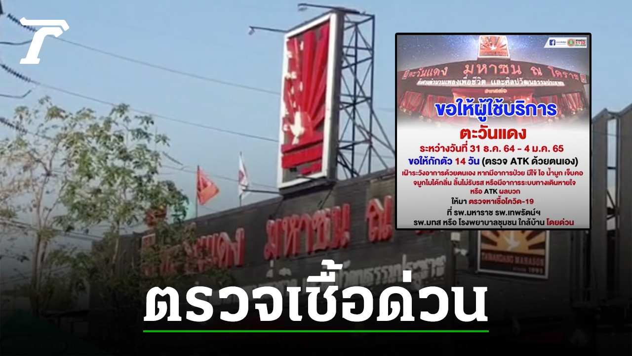 เมื่อวันที่ 11 มกราคม 2565 ผู้สื่อข่าวรายงานว่า ศูนย์โควิด-19 โคราช สำนักงานสาธารณสุขจังหวัดนครราชสีมา และเทศบาลนครนครราชสีมา ได้ออกประกาศผ่านสื่อโซเชียล ขอให้ผู้ที่ไปใช้บริการที่ร้านตะวันแดง มหาชน ณ โคราช ต.ในเมือง อ.เมืองนครราชสีมา จ.นครราชสีมา ระหว่างวันที่ 31 ธันวาคม 2564-4 มกราคม 2565 ขอให้กักตัวเอง 14 วัน และตรวจ ATK พร้อมกับเฝ้าระวังสังเกตอาการตัวเอง หากมีอาการเจ็บป่วย มีไข้ ไอ นำมูก เจ็บคอ จมูกไม่ได้กลิ่น ลิ้นไม่รับรส หรือมีอาการทางระบบทางเดินหายใจ ให้ไปตรวจหาเชื้อโควิด-19 ที่ รพ.มหาราชนครราชสีมา, รพ.เทพรัตน์นครราชสีมา, รพ.มทส. หรือโรงพยาบาลชุมชนใกล้บ้านโดยด่วน เนื่องจากทีมสอบสวนโรคสำนักงานสาธารณสุขจังหวัดฯ และเทศบาลนครฯ ได้แจ้งรายงานให้ที่ประชุมศูนย์บัญชาการตอบโต้โรคติดเชื้อไวรัสโคโรนา 2019 (COVID-19) จังหวัดนครราชสีมา ทราบว่า มีพนักงาน “ตะวันแดง มหาชน ณ โคราช” ร้านอาหารกึ่งผับเพลงเพื่อชีวิต ตั้งอยู่ในเขตเทศบาลนครนครราชสีมา ป่วยติดเชื้อโควิด-19 จำนวน 4 ราย จึงแจ้งนักเที่ยวหรือผู้ที่มีไทม์ไลน์เกี่ยวข้องในช่วงเวลาดังกล่าว ซึ่งเป็นช่วงเทศกาลส่งท้ายปีเก่าต้อนรับปีใหม่ ให้กักตัวและไปตรวจหาเชื้อเป็นการเร่งด่วน