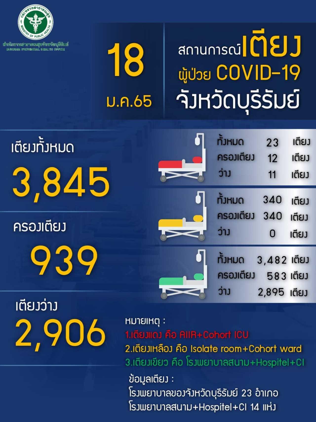 ในส่วนของสถานการณ์เตียง ผู้ป่วยโควิด-19 จังหวัดบุรีรัมย์ เตียงทั้งหมด 3,845 เตียง ครองเตียง 939 เตียง เหลือเตียงว่าง 2,906 เตียง แยกเป็น ผู้ป่วยสีแดง ทั้งหมด 23 เตียง ครองเตียง 12 เตียง มีเตียงว่าง 11 เตียง ผู้ป่วยสีเหลือง ทั้งหมด 340 เตียง ครองเตียง 340 เตียง ไม่มีเตียงว่าง และ ผู้ป่วยสีเขียว ทั้งหมด 3,482 เตียง ครองเตียง 583 เตียง เหลือเตียงว่าง 2,895 เตียง