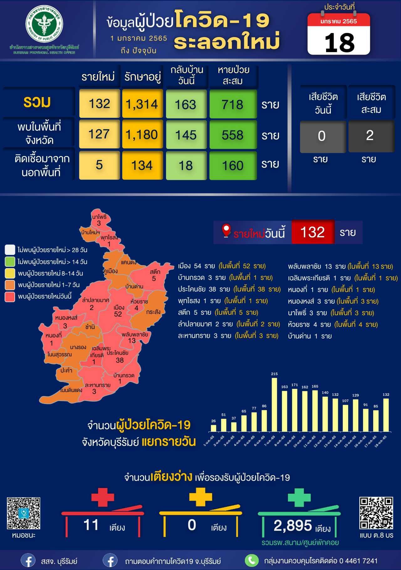 เมื่อวันที่ 19 ม.ค. 65 ศูนย์ปฏิบัติการตอบโต้ภาวะฉุกเฉิน สำนักงานสาธารณสุขจังหวัดบุรีรัมย์ รายงานข้อมูลสถานการณ์แพร่ระบาดของโรคติดเชื้อไวรัสโควิด-19 หรือ (โควิด-19) ระลอกใหม่ มกราคม ตั้งแต่วันที่ 1 ม.ค.2565 ถึงวันที่ 18 ม.ค.2565 ของ จ.บุรีรัมย์ ว่า วันที่ 18 ม.ค.ที่ผ่านมา พบผู้ป่วยยืนยันติดเชื้อโควิด-19 รายใหม่ จำนวน 132 ราย ในจำนวนนี้ไม่มีผู้เสียชีวิต โดยส่วนใหญ่พบผู้ป่วยติดเชื้อในพื้นที่จังหวัด 127 ราย ในจำนวนนี้พบมากที่สุดในพื้นที่ อ.เมืองบุรีรัมย์ 52 ราย และติดเชื้อมาจากนอกพื้นที่ 5 ราย ซึ่งติดเชื้อมาจากจังหวัดเสี่ยงทั้งหมด รวมยอดผู้ป่วยสะสมระลอกใหม่ เริ่มมกราคม 2565 มีจำนวน 2,034 ราย