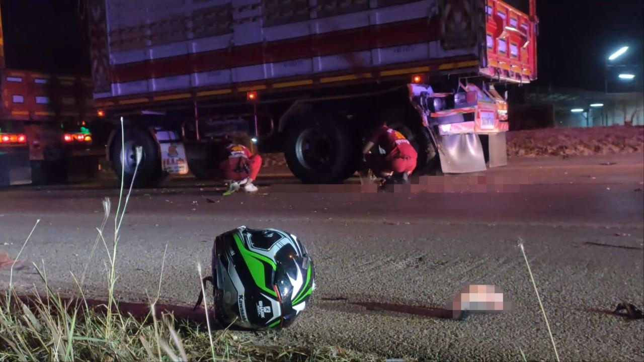 หนุ่มซิ่ง จยย.ชนท้ายรถพ่วง ชะลอเข้าด่านตรวจฯ กะโหลกแตกดับสยอง ตำรวจคาดผู้ตายขับมาเร็ว-เบรกไม่ทัน พุ่งเสยท้ายแรงชนทำให้เสียชีวิต