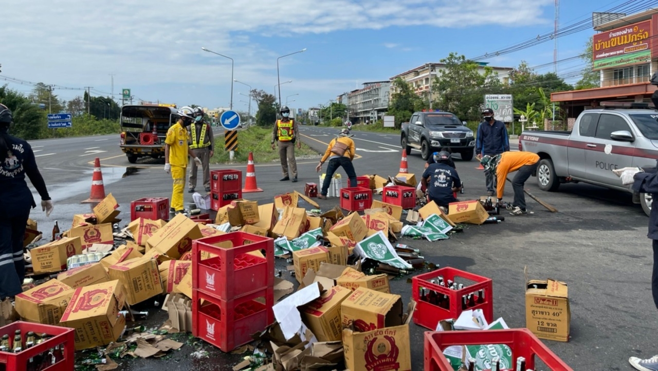 รถบรรทุกเหล้าเบียร์ เลี้ยวยูเทิร์นกลับรถที่บุรีรัมย์ โครงรั้วหลุด เททั้งเหล้าทั้งเบียร์แตกเกลื่อนถนนกว่า 100 ลัง ค่ากว่า 3 แสนบาท คนงานนั่งบนลังเหล้า ร่วงตามลงมาบาดเจ็บ