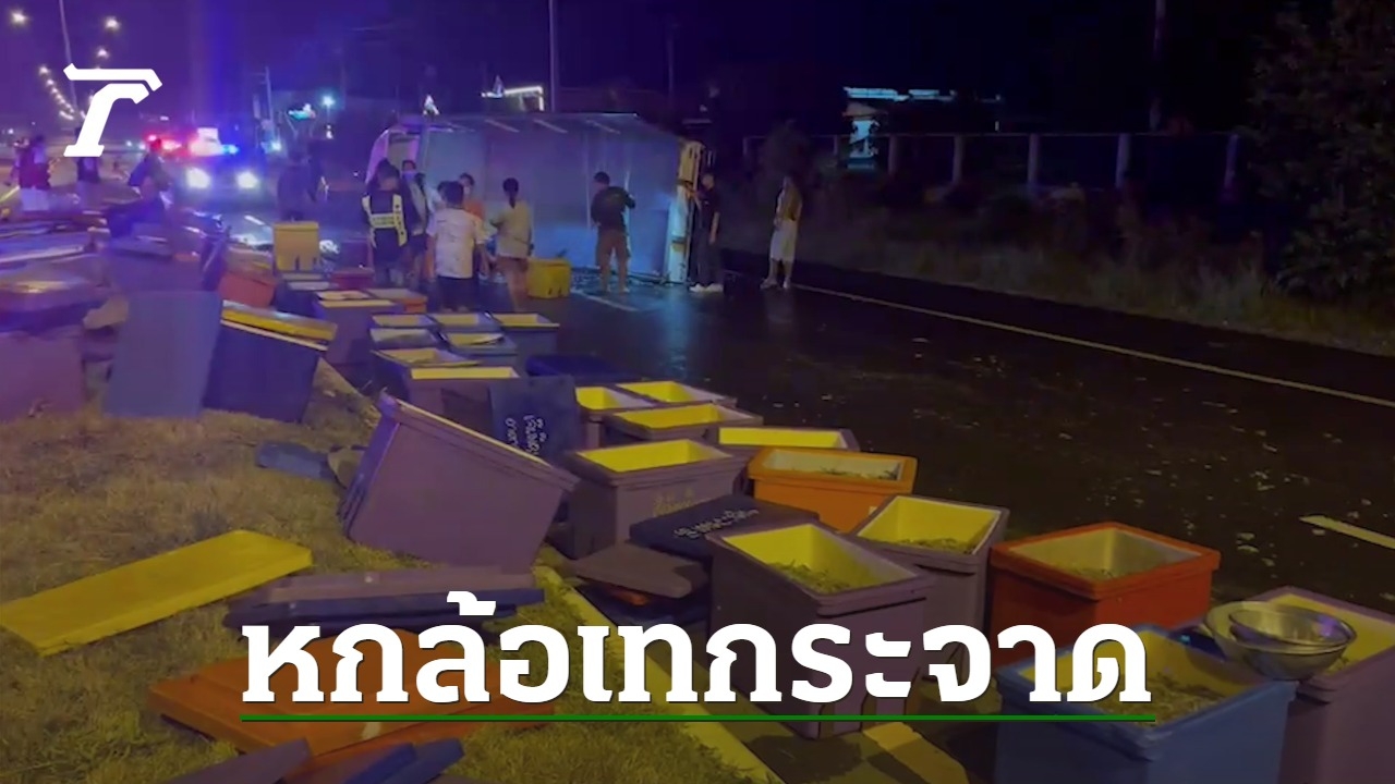 2 ผัวเมีย ขับหกล้อบรรทุกกุ้งสดจากจันทบุรี มุ่งหน้าไปส่งที่ จ.นครพนม ระหว่างทางยางหลังระเบิด เสียหลักหมุนเคว้ง-พยายามประคอง แต่เอาไม่อยู่ พลิกคว่ำเทกระจาด กล่องเก็บความเย็น-กุ้ง 2 ตัน ตกเกลื่อนถนน จนท.รุดช่วยเก็บกู้กว่า 2 ชม.