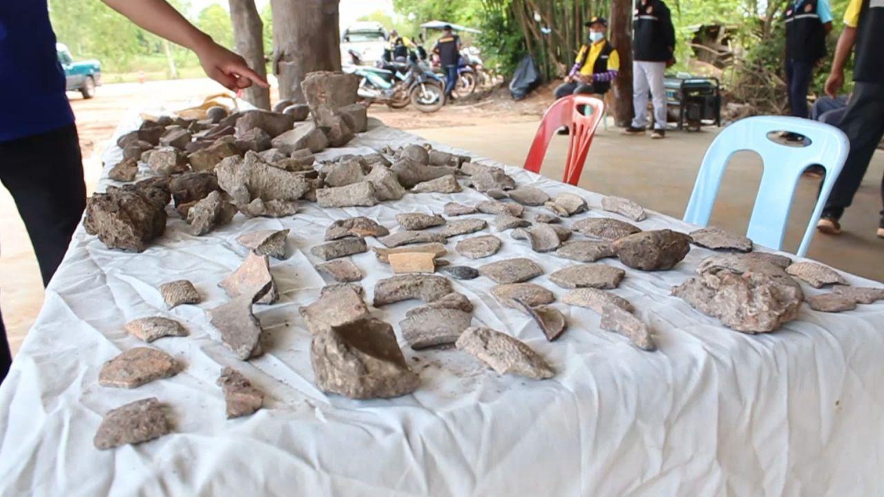 "หลักฐานพบมีตั้งแต่ยุคหินเก่า เป็นหินกรวดจากแม่น้ำโขงพบเฉพาะที่นี่ ใกล้เคียงไม่พบ น่าจะนำมาใช้ในการล่าสัตว์ เมื่อทุบให้แตกจะเกิดเป็นคม และดัดแปลงเป็นอาวุธ, จากนั้นมาเป็นยุคหินใหม่ จากการใช้หินกรวดธรรมดา ก็มาใช้หินอื่นๆ เมื่อรู้วิธีทำ พบมีอุปกรณ์ขัดทำรูปทรง ให้เป็นอาวุธ และเครื่องประดับ, ต่อมาเป็นกระดูกมนุษย์ ที่ถูกฝังแบบมีพิธีกรรม กระดูกสัตว์ขนาดใหญ่ และมาถึงหม้อดินเผายุคเดียวกันบ้านเชียงตอนต้น โดยยังไม่พบเหล็ก หรือสำริด" นายดุสิต กล่าว