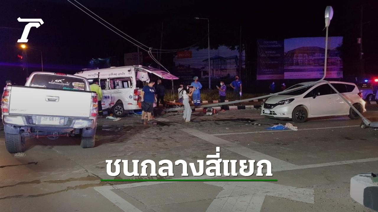 กระบะชนรถโรงพยาบาลกลางสี่แยกไฟแดง อ.เมืองขอนแก่น คนป่วยพร้อมญาติและพยาบาลเจ็บระนาว อุปกรณ์กู้ชีพกระจายเกลื่อน รถพังยับเยิน