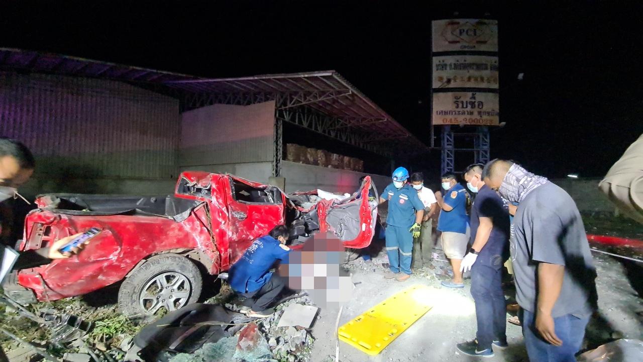 พบรถกระบะฟอร์ด 4 ประตู สีแดง หมายเลขทะเบียน กม 1853 อุบลราชธานี ชนกำแพงของโรงงานรับซื้อเศษกระดาษ ทะลุเข้าไปถึงด้านในโรงงาน ด้านข้างตัวรถพบร่างนางสาวพิมพ์นิภา (ขอสงวนนามสกุล) อายุ 45 ปี สวมเสื้อกล้ามแขนสั้นสีชมพู กางเกงขาสั้นสีชมพู นอนคว่ำหน้าเสียชีวิต ภายในรถพบเนื้อสมองกระเด็นตกอยู่ที่พื้นเจ้าหน้าที่กู้ภัยจึงได้รวบรวมชิ้นส่วนร่างกายมารวมกันก่อนจะทำการบรรจุถุงซิปนำส่งแผนกนิติเวชโรงพยาบาลสรรพสิทธิประสงค์