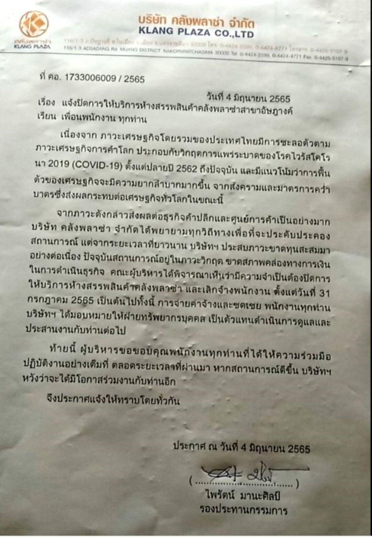 จากภาวะดังกล่าวส่งผลต่อธุรกิจค้าปลีก และศูนย์การค้าเป็นอย่างมาก บริษัท คลังพลาซ่า จำกัด ได้พยายามทุกวิถีทางเพื่อที่จะประคับประคองสถานการณ์ แต่จากระยะเวลาที่ยาวนาน บริษัทประสบภาวะขาดทุนสะสมมาอย่างต่อเนื่อง ปัจจุบันสถานการณ์อยู่ในภาวะวิกฤต ขาดสภาพคล่องทางการเงินในการดำเนินธุรกิจ คณะผู้บริหารได้พิจารณาเห็นว่า มีความจำเป็นต้องปิดการให้บริการห้างสรรพสินค้าคลังพลาซ่า และเลิกจ้างพนักงาน ตั้งแต่วันที่ 31 กรกฎาคม 2565 เป็นต้นไป ทั้งนี้ การจ่ายค่าจ้างและชดเชยพนักงานทุกท่าน บริษัทฯ ได้มอบหมายให้ฝ่ายทรัพยากรบุคคล เป็นตัวแทนดำเนินการดูแลและประสานงานต่อไป หากสถานการณ์ดีขึ้น บริษัทฯ หวังว่าจะได้มีโอกาสร่วมงานกับท่านอีก”