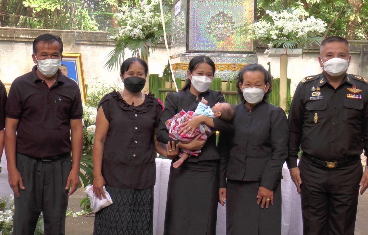 ภรรยาของ สห.เกิ้ล ที่ถูก สห.รุ่นพี่ที่ยิงตายคาป้อม ค่ายพระยอดเมืองขวาง อุ้มลูกน้อยเจอหน้าพ่อครั้งสุดท้ายก่อนทำพิธีฌาปนกิจ ตามความเชื่อของชนเผ่าผู้ไท ครอบครัวภูมิใจ มทบ.210 จัดกองเกียติยศให้