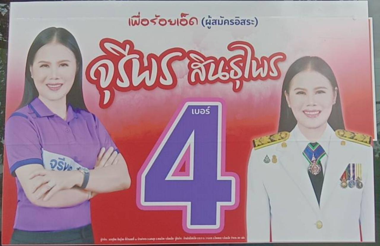 ส่วนเบอร์ 4 นางจุรีพร สินธุไพร ทีมเพื่อร้อยเอ็ด ผู้สมัครอิสระ มีข้อความ “ลูกไทบ้านเข้าถึงพึ่งได้ ทางเลือกใหม่ เพื่อร้อยเอ็ดบ้านเราที่สำคัญ” ซึ่งต่างลงพื้นที่จัดเวทีปราศรัย ประกาศนโยบายและขอคะแนนจากประชาชนใน 20 อำเภอจังหวัดร้อยเอ็ด ทั้งนี้ คาดว่าผู้ที่ชนะเลือกตั้ง จะมีได้คะแนนเสียงมากกว่า 1 แสนคะแนนขึ้นไป.