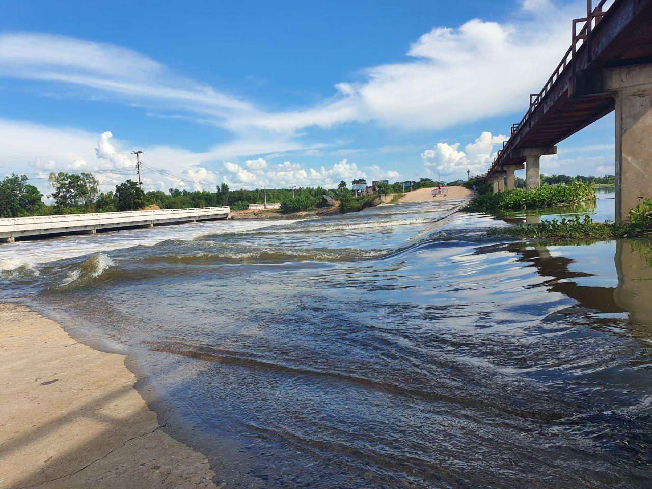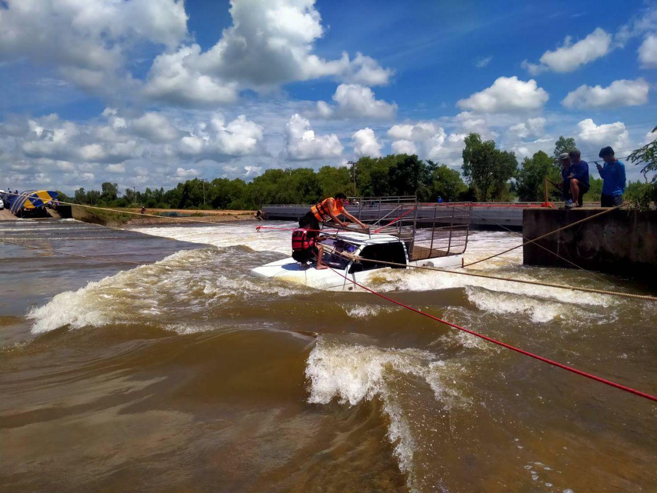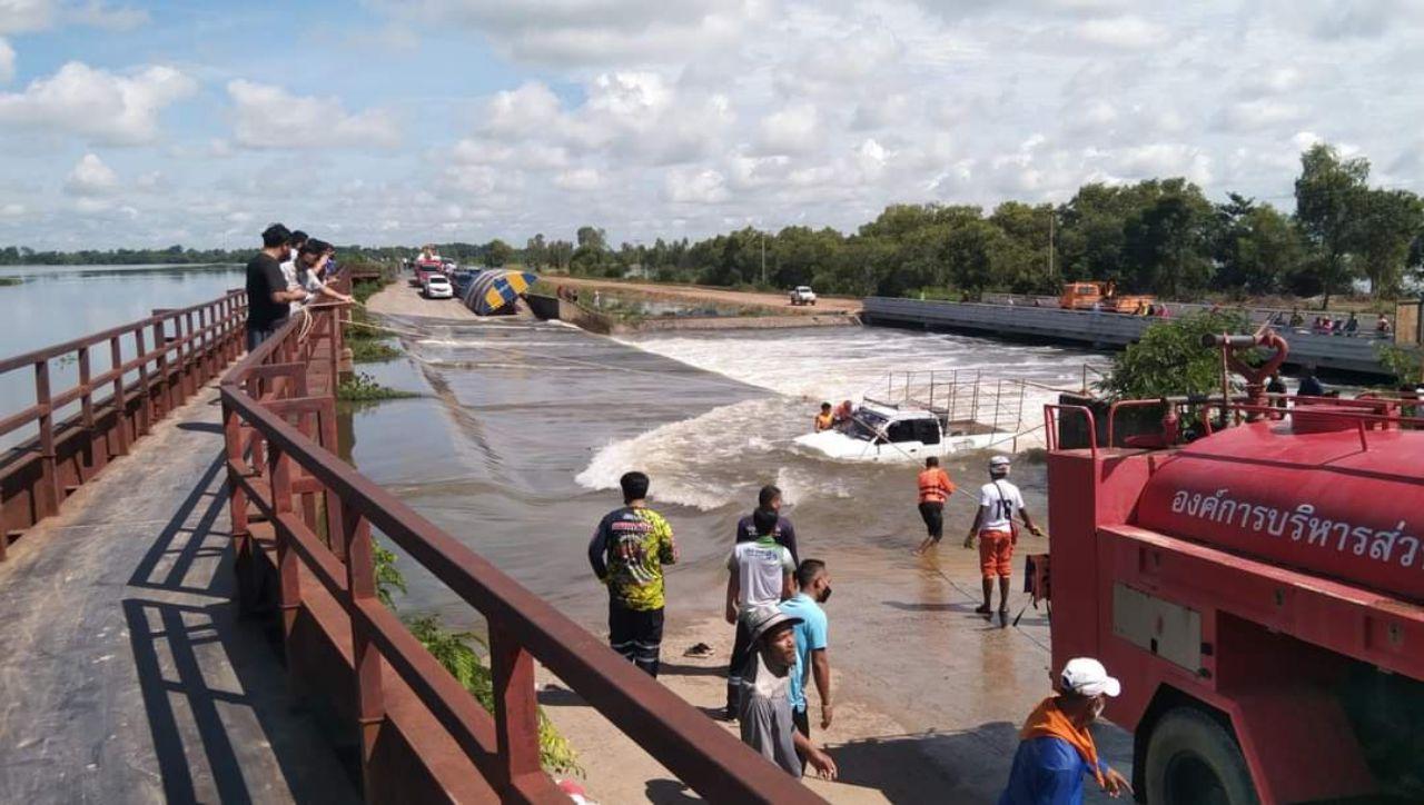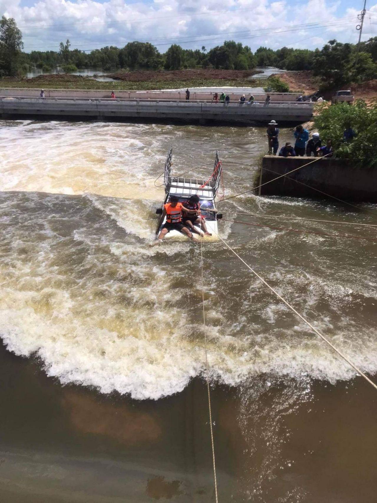 หลังจาก 2 ตายายขับรถฝ่าน้ำได้สักพัก พอถึงช่วงกลางฝายที่มีมวลน้ำเชี่ยวแรง จึงทำให้รถยนต์กระบะเซไปจะออกไปที่คลอง ประกอบกับกระแสน้ำพัดแรงไหลเชี่ยวจะตกลงไปทั้งรถทั้งคน ซึ่งคนขับรถยนต์กระบะได้เหยียบเบรกให้อยู่นิ่ง เจ้าหน้าที่จึงรีบเข้าไปช่วยและได้ช่วยยายออกมาได้ก่อน ส่วนคนขับเจ้าหน้าที่ได้ใช้ลวดสลิงมามัดแล้วให้เจ้าหน้าพร้อมกับชาวบ้านช่วยกันลากขึ้นฝายน้ำล้นได้อย่างปลอดภัย และโชคดีที่เจ้าหน้าที่อยู่ตรงนั้นเลยเข้าช่วยเหลือได้ทันเวลา