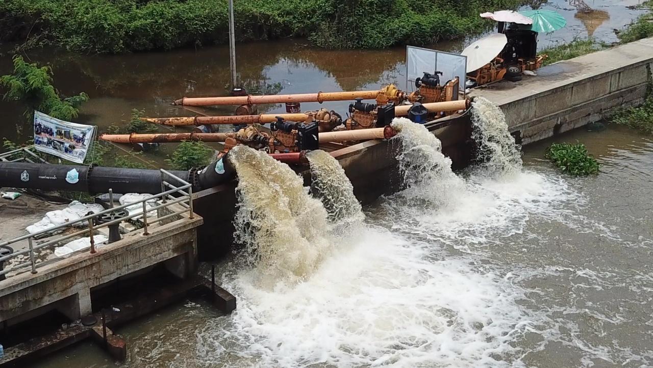 สำหรับในจุดดังกล่าว นอกจากจะมีการเสริมกระสอบให้แข็งแรง สำนักงานชลประทานที่ 7 และสำนักงานทรัพยากรน้ำจังหวัด ได้นำเครื่องสูบน้ำขนาด 12 นิ้ว จำนวน 2 เครื่อง ซึ่งมีกำลังสูบน้ำได้วันละ 40,000 ลูกบาศก์เมตร เพื่อดึงน้ำออกจากหนองท่ากอไผ่ เพื่อชะลอน้ำไม่ให้ไหลท่วมชุมชนเป็นวงกว้าง