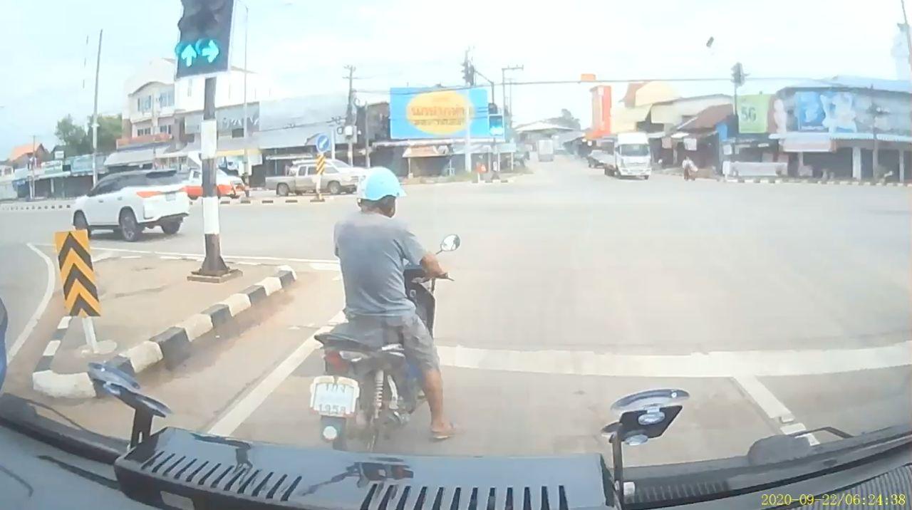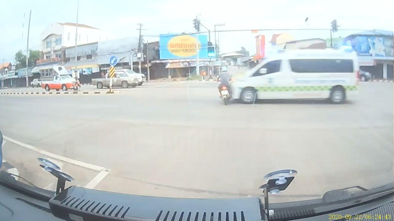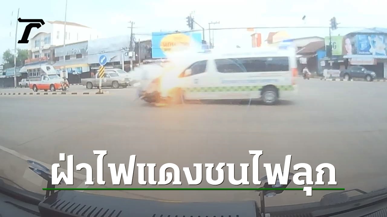ภาพจากกล้องหน้ารถตู้ เผยภาพนาทีมรณะเมื่อ รถฉุกเฉิน รพ.ยางตลาด จ.กาฬสินธุ์ ได้ผ่าไฟแดงมาชนกับรถจักรยานยนต์ ไฟลุกที่กลางสี่แยกไฟแดง อ.เชียงยืน แยกทางหลวงหมายเลข 12 ตัดกับทางหลวง 2322