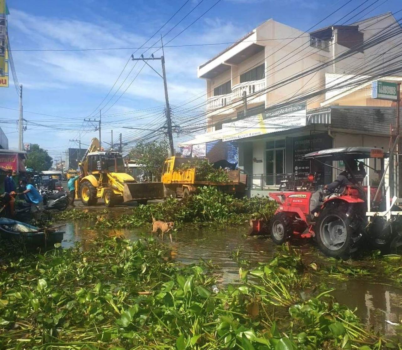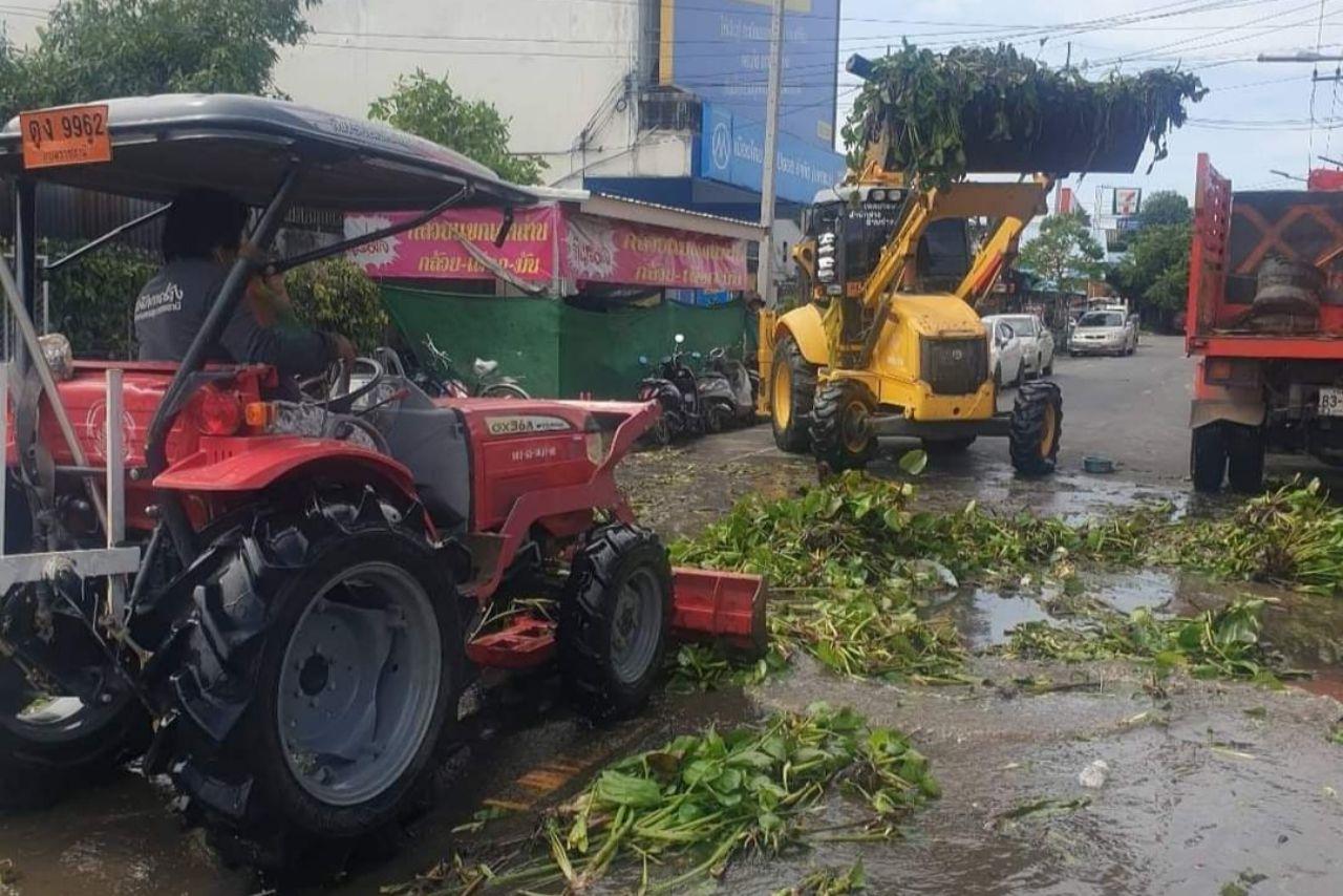 ขณะที่บริเวณถนนสมเด็จ ชุมชนศาลากลางบ้านดู่ เทศบาลนครอุบลราชธานี นอกจากจะประสบปัญหาน้ำท่วมบ้านเรือนแล้ว ยังประสบความลำบากในการพายเรือออกจากบ้าน เพราะบรรดาผักตบชวาจำนวนมากที่ไหลมากับน้ำต่างมากองรวมกัน กีดขวางทางเข้าออกหมู่บ้าน เจ้าหน้าที่เทศบาลนครอุบลราชธานีต้องมาดำเนินการรื้อผักตบชวาออก ให้ประชาชนได้สัญจรพายเรือ หรือลุยน้ำ ออกมาได้สะดวกและปลอดภัย เพราะเกรงว่าจะมีสัตว์มีพิษลอยมากับผักตบชวาด้วย