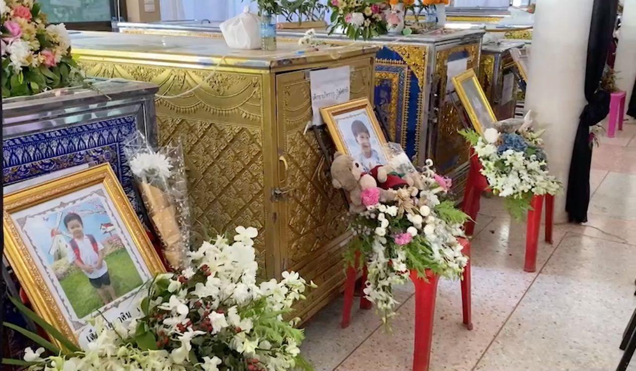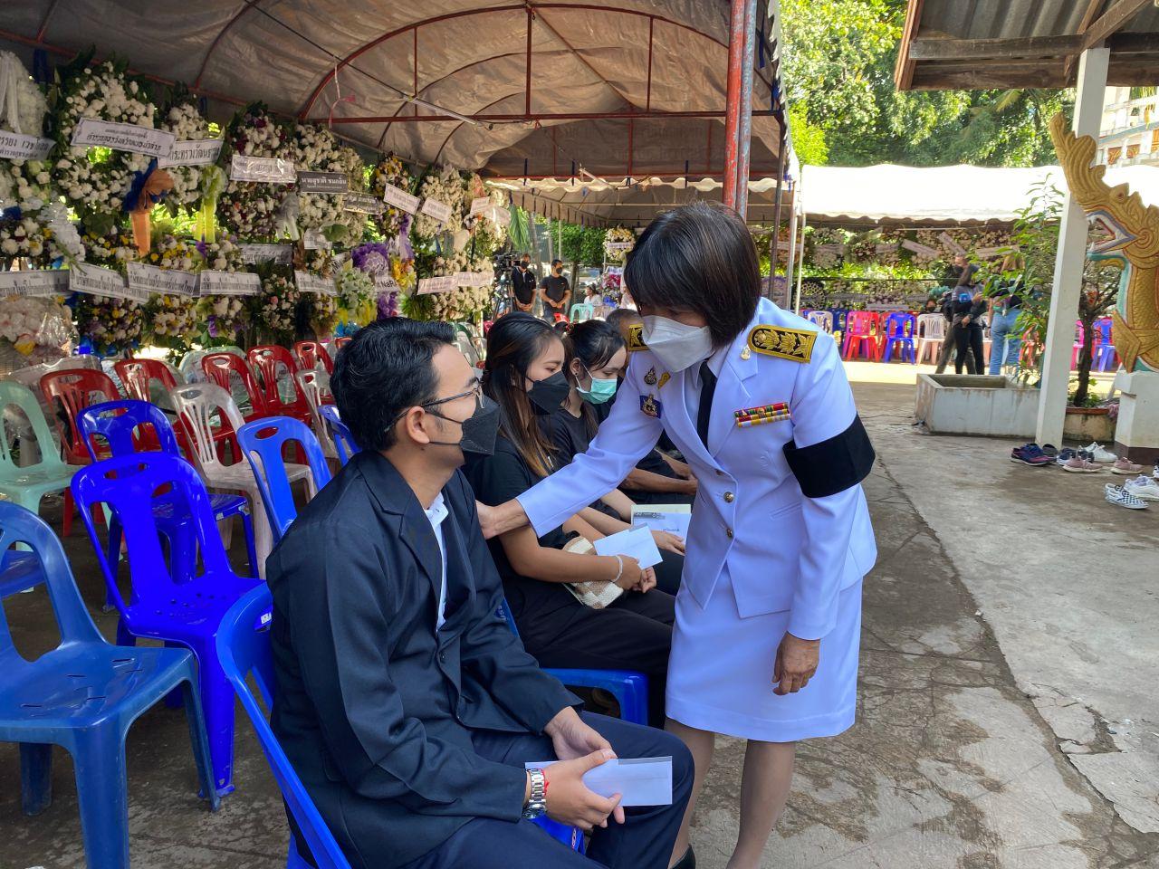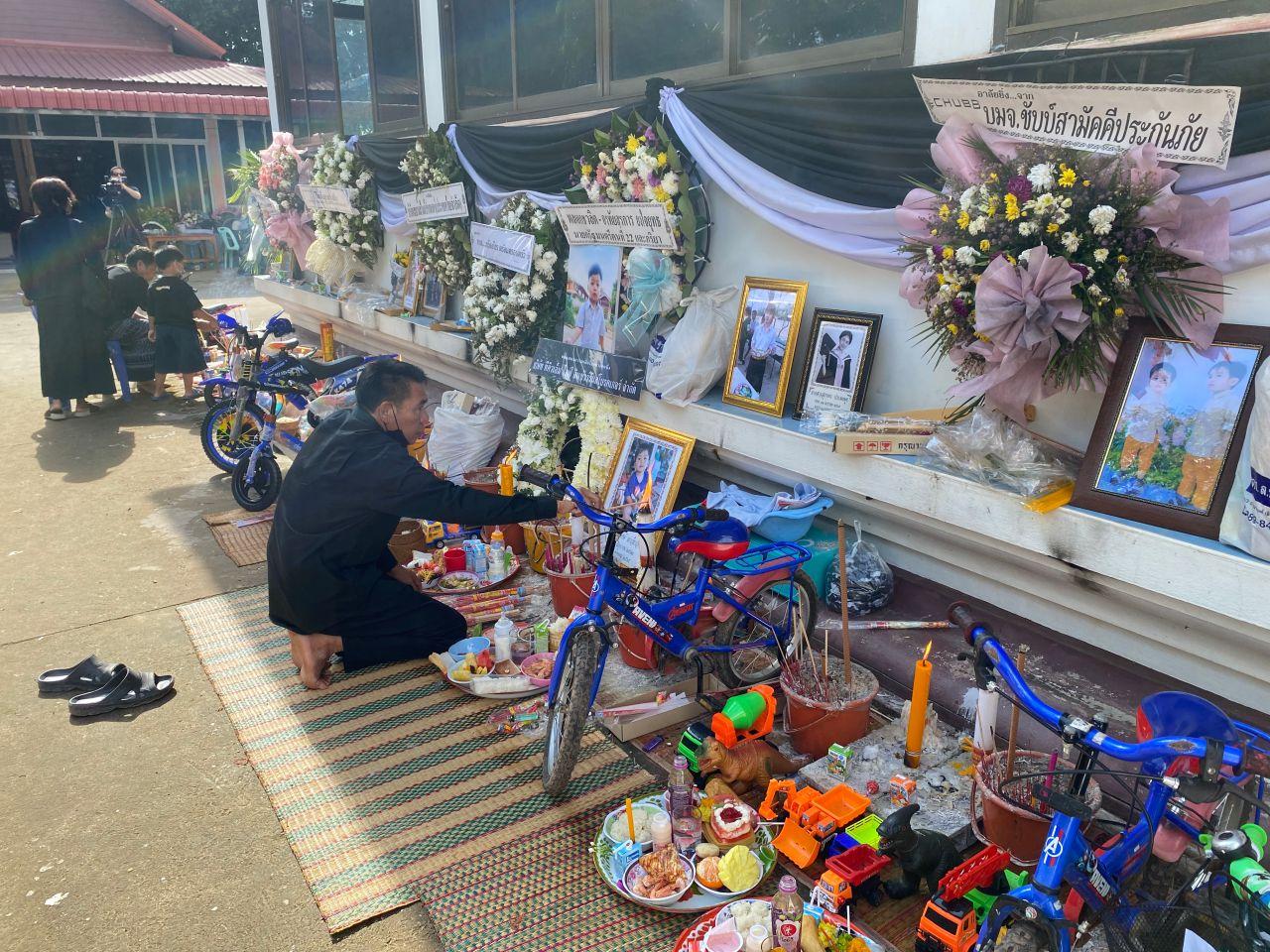 เช่นเดียวกับที่วัดเทพมงคลชัย ช่วงเช้ามีครอบครัว ผู้เสียชีวิตจำนวน 6 รายมาร่วมงาน ก่อนพิธีสวดญาติผู้เสียชีวิตได้จุดธูปหน้าโรงศพเพื่อเป็นแสดงความอาลัย ขณะที่ ทาง จนท.มูลนิธิ ได้เปลี่ยนชุดอาชีพในฝันให้น้องๆ ทั้งหมด 2 ศพ โดยจนท.วัฒนธรรมจังหวัดหนองบัวลำภูเป็นประธานในพิธี พระสงฆ์สวดพระพุทธมนต์ จำนวน 10 รูป ประจำอาสนสงฆ์ และมีพระสมณศักดิ์ จำนวน 11 รูป สวดพุทธมนต์ (สวดธรรมนิยาม) จากนั้นพระสงฆ์องค์ถวายพระธรรมเทศนาขึ้นประจำธรรมมาสน์