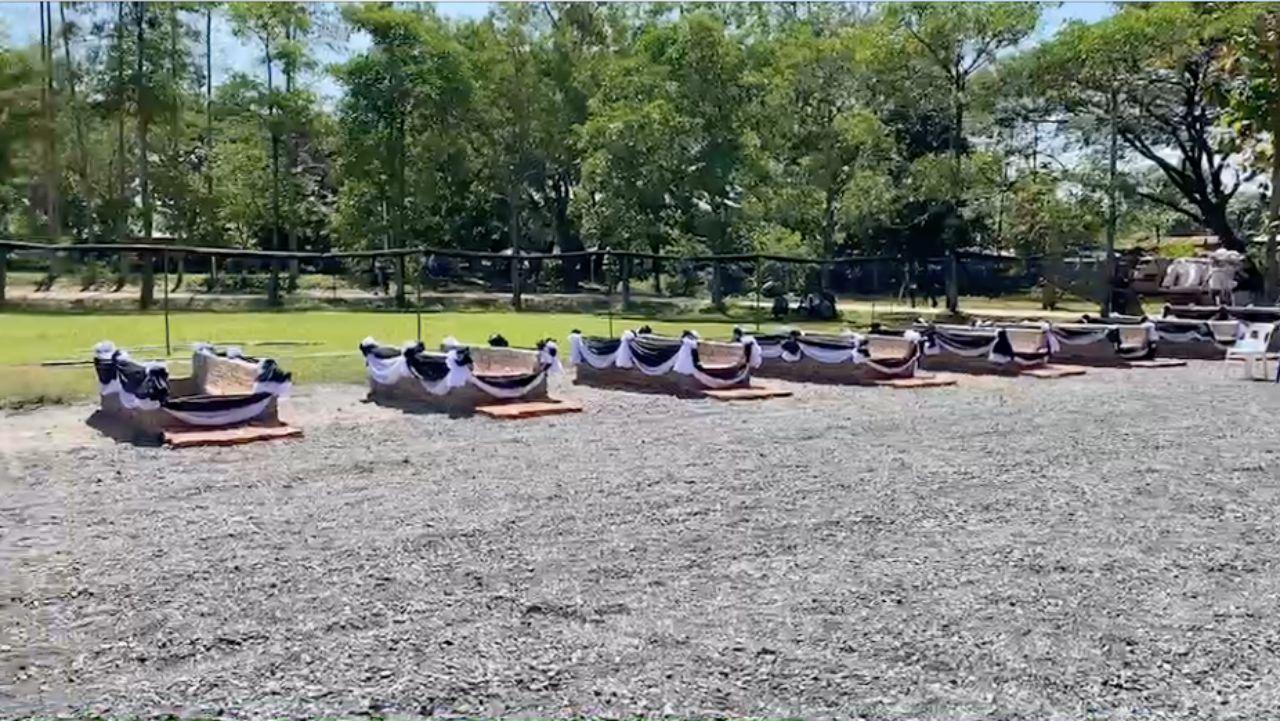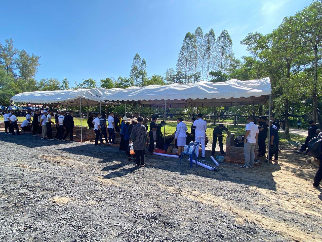 ส่วนด้านนอกที่มีการทำเตาเผาแบบเชิงตะกอนนั้น มีขนาดความกว้าง 80 เซนติเมตร ยาว 2 เมตร 30 เซนติเมตร และสูง 60-80 เซนติเมตร ก่อเป็นรูปแบบเดียวกัน ทั้ง 19 บล็อกนั้นในขณะนี้ใกล้เสร็จสมบูรณ์แล้ว จนท.เตรียมวางอิฐเพิ่มบริเวณด้านหน้าจุดเชิงตะกอน ขณะเดียวกันทางเจ้าหน้าที่และชาวบ้านต่างนำผ้าขาว-ดำมาผูกบริเวณรอบๆ บล็อกทั้ง 19 บล็อกแล้ว จากนั้น อบต.อุทัยสวรรค์ เป็นประธานในพิธีประกอบพิธีสวดพระพุทธมนต์ และถวายภัตตาหารเพลแด่พระสงฆ์ เพื่อบำเพ็ญกุศลศพแก่เหยื่อทั้ง 19 ราย