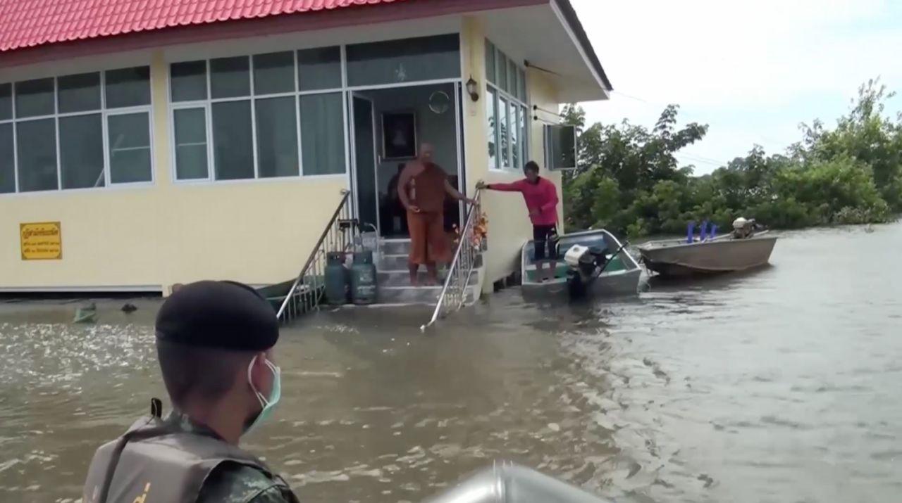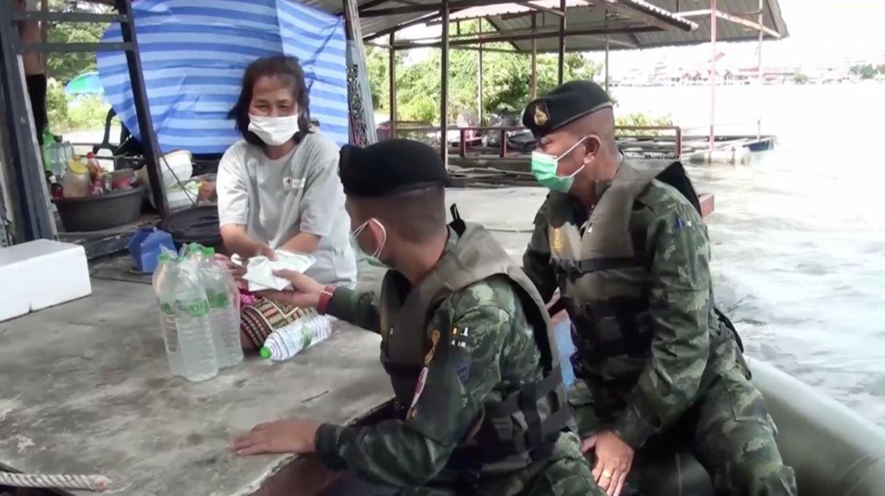 ขณะเดียวกันได้ล่องเรือพูดคุยกับชาวบ้าน พร้อมมอบข้าวกล่อง น้ำดื่ม ยาให้ชาวบ้าน ซึ่งบ้านถูกน้ำท่วมถึงชั้นที่สองของบ้าน แต่ยังไม่ยอมอพยพออกมา เพราะต้องเฝ้าดูแลทรัพย์สินไม่ให้ถูกโจรมาขโมย จากการสอบถามทราบว่า ได้ตรวจวัดน้ำท่วมด้วยตัวเอง วันนี้ระดับน้ำเพิ่มขึ้นเพียง 1 เซนติเมตร แต่ปีนี้น้ำมากกว่าปี 2562 และระหว่างอาศัยอยู่ที่บ้าน ต้องผจญกับสัตว์มีพิษพวกตะขาบที่หนีน้ำมาซุกซ่อนอยู่ตามข้าวของเครื่องใช้ จึงต้องใช้ความระมัดระวังเวลาหยิบจับสิ่งของในช่วงนี้