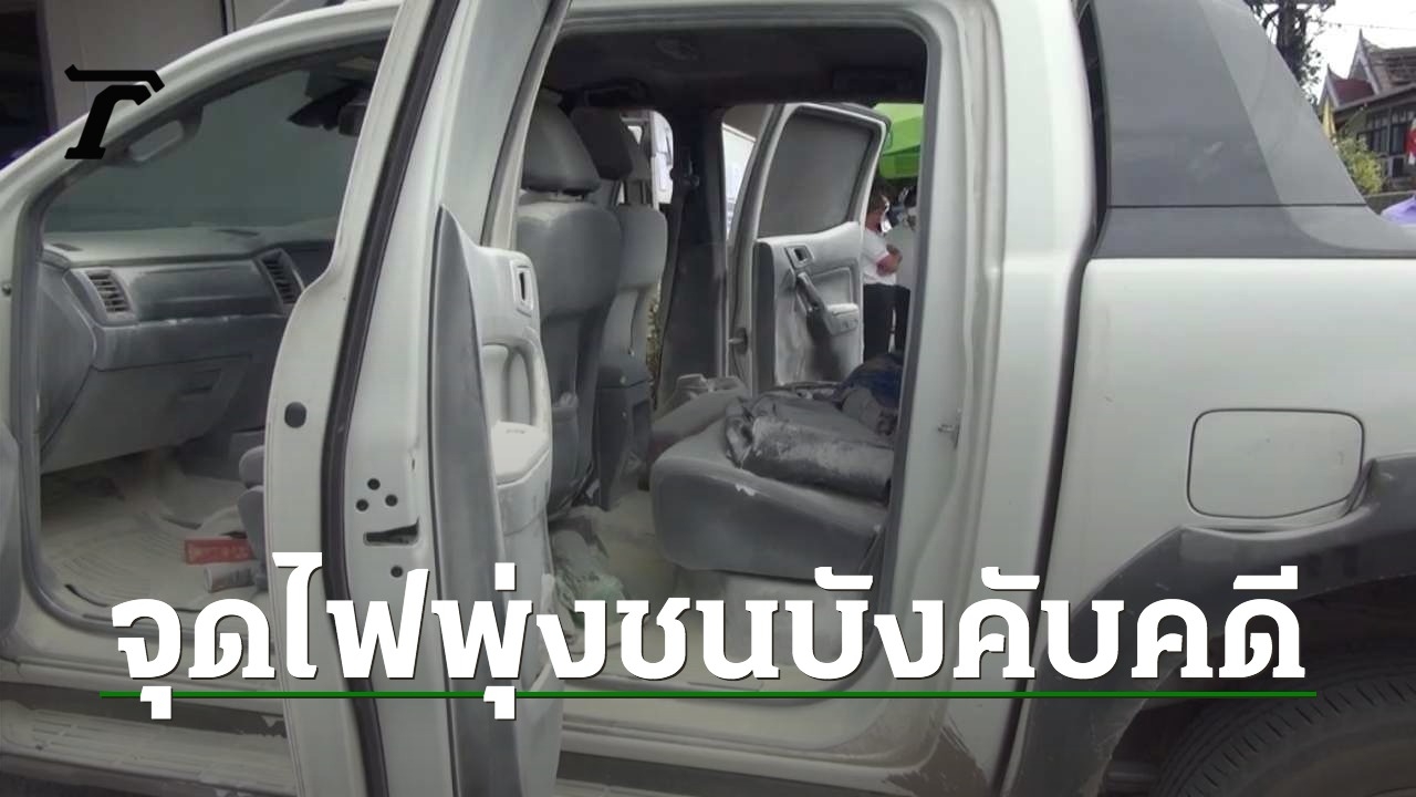 บุรีรัมย์ระทึก ลุง 58 ขับรถยนต์บรรทุกแกลลอนน้ำมัน พร้อมจุดไฟพุ่งชน สนง.บังคับคดีบุรีรัมย์ คาดเครียดถูกฟ้องยึดที่ดิน โชคดีไฟไม่ไหม้ รปภ.เอาถังดับเพลิงดับทัน ส่วนผู้ก่อเหตุโคม่า เพราะสูดควันไฟ