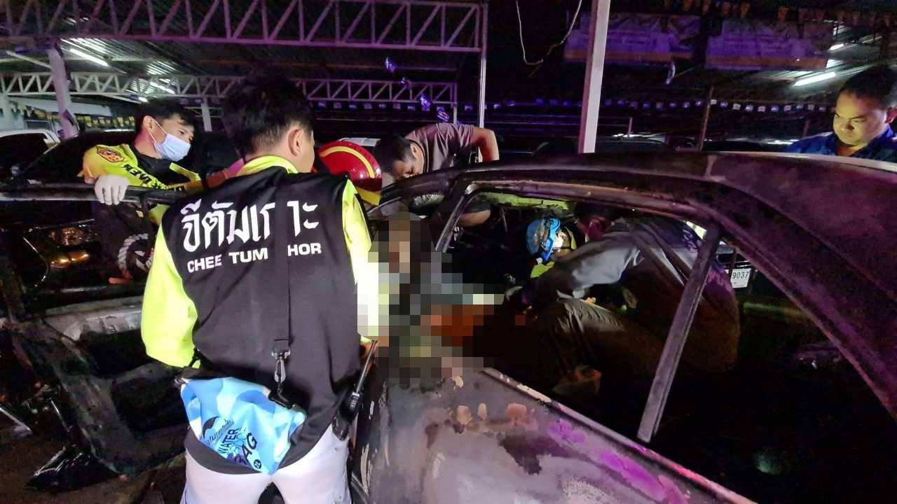 ตรวจภายในที่นั่งด้านหน้าซ้ายของรถพบผู้เสียชีวิต 1 ราย ทราบชื่อคือ พ.อ.ต.ทวีวัฒน์ กุลบุตร์ 30 ปี (ผู้โดยสาร) โดยหลังเพลิงสงบเจ้าหน้าที่ต้องใช้เครื่องตัดถ่างงัดประตูทางด้านซ้ายที่พบร่างของ พ.อ.ต.ทวีวัฒน์ นานประมาณ 10 นาที จึงนำร่าง พ.อ.ต.ทวีวัฒน์ ออกมาได้ ส่วนคนขับรถพลเมืองดีสามารถช่วยนำตัวออกมาได้ก่อนจะเกิดเพลิงไหม้ คือ พ.อ.อ.วันชัย โพธิ์คำ 32 ปี ทหารอากาศ สังกัดกองบิน 21 อุบลราชธานี คนขับรถเก๋ง ได้รับบาดเจ็บ