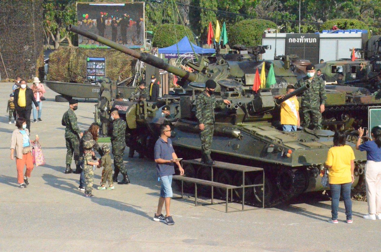 ภายในงานมีการจัดแสดงโชว์อาวุธยุทโธปกรณ์จำนวนมากมาจัดแสดงให้เด็กได้สัมผัสได้เล่นได้ปีนป่ายอย่างสนุกสนานและอย่างใกล้ชิด อาทิ รถถังหนัก รถถังเบา, รถถังสะเทินน้ำสะเทินบก, ปืนใหญ่, ปืนต่อสู้อากาศยาน ขนาด 155 มม., เรือกู้ภัยทางน้ำ, เรือขนส่งลำเลียงช่วยเหลือประชาชน, กองกำลังหน่วยซีล, กองกำลังชุดค้นหาและทำลายวัตถุระเบิดหรือวัตถุอันตราย โดยเฉพาะรถถังยานเกาะขนาดหนักเป็นพระเอกตัวจริงของเด็กๆ ต่างให้ความสนอกสนใจกันเป็นมาก