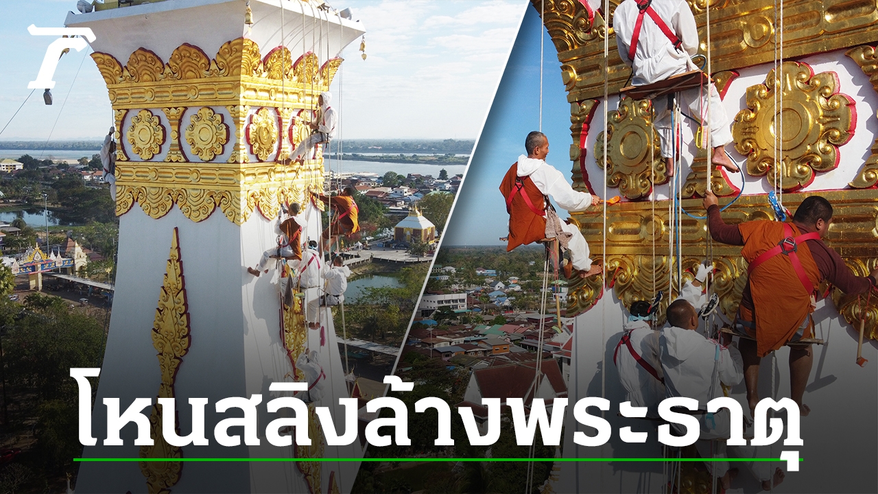 ทึ่ง พลังศรัทธา พระ ศิษยานุศิษย์ รวมตัวโชว์ผาดโผนโหนสลิง ความสูงเกือบ 60 เมตร เพื่อสรงน้ำทำความสะอาดองค์พระธาตุพนม จากยอดพระธาตุพนม เพื่อสร้างความสง่างาม ในงานบุญใหญ่อีสาน พระธาตุพนม 9 วัน 9 คืน