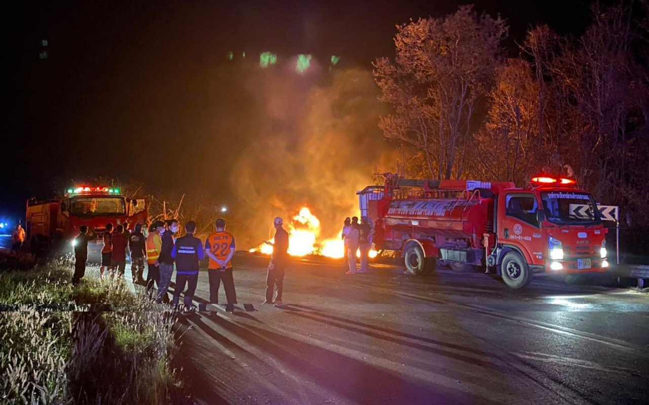 อุบัติเหตุรถบรรทุกน้ำมัน เสียหลักหลุดโค้งขณะขึ้นภูเขาที่อ.ท่าลี่ จ.เลย พลิกคว่ำตกเขาไฟลุกไหม้ทั้งคัน กลิ่นน้ำมันและควันฟุ้งกระจายไม่สามารถเข้าใกล้ได้ มีคนบาดเจ็บถูกนำส่งรพ.ไปแล้ว