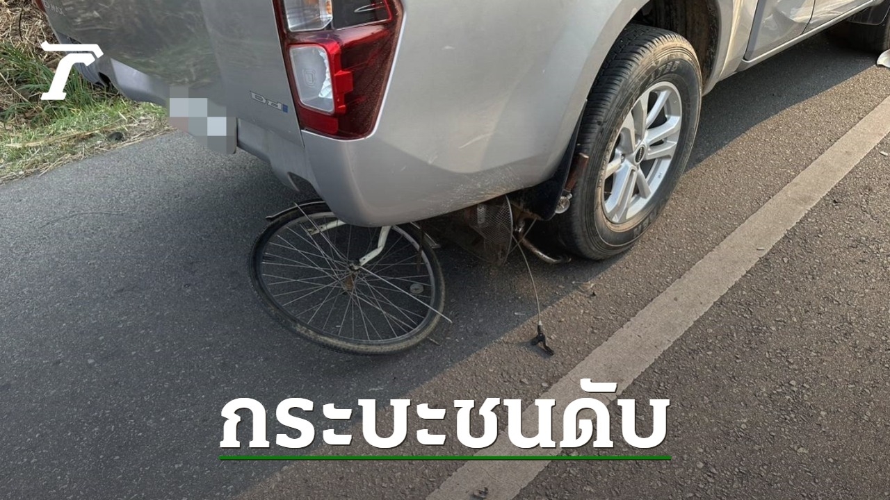 สลด หนุ่มใหญ่ปั่นจักรยานข้ามถนน กระบะทางตรงมาด้วยความเร็ว เบรกไม่ทันพุ่งชนกระเด็น ทั้งรถทั้งคนมุดใต้ท้องรถจอดข้างทางเสียชีวิต ที่กาญจนบุรี