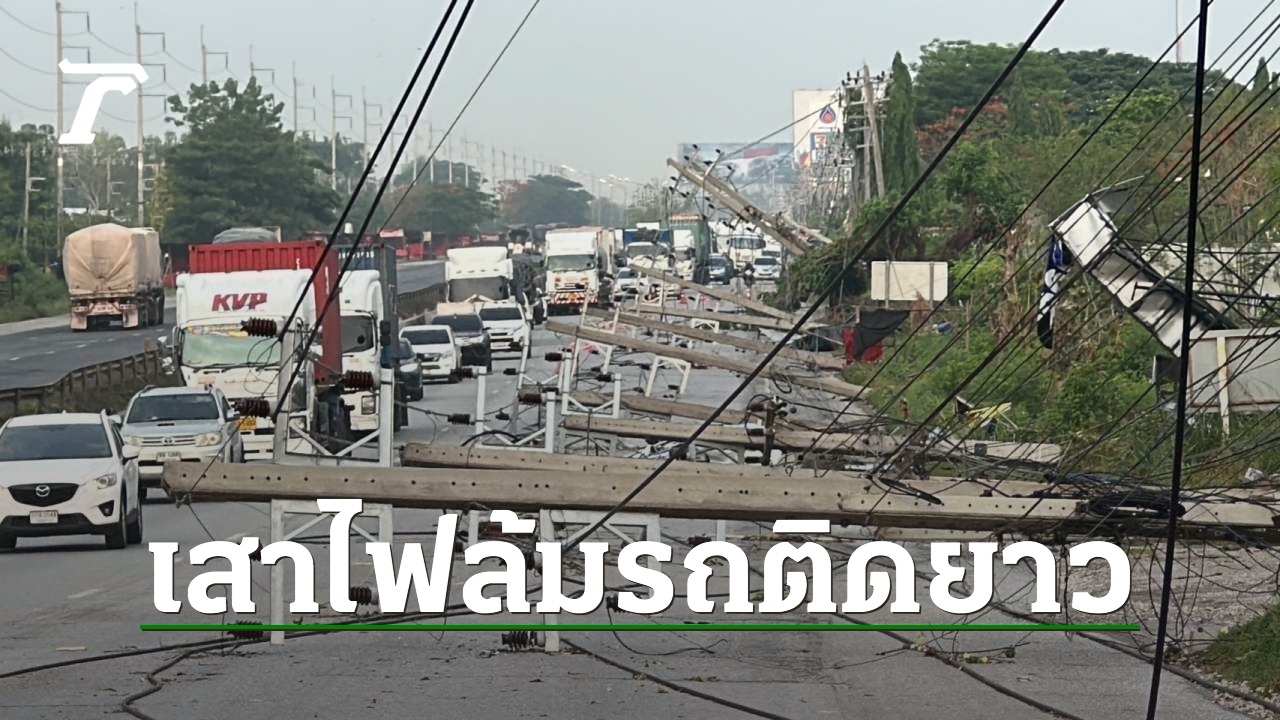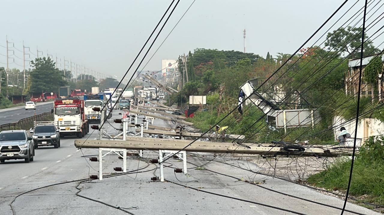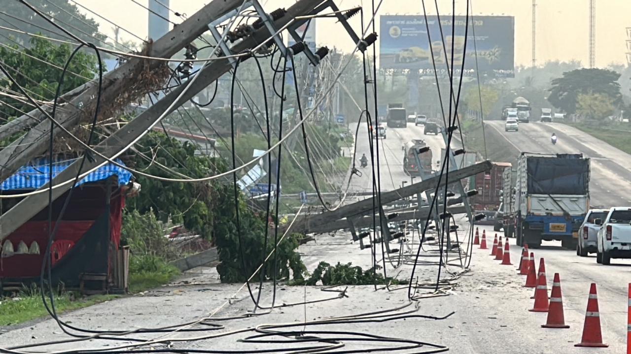 พายุถล่ม อ.ปากช่องช่วงเช้าทำเสาไฟฟ้าแรงสูง ริมถนนมิตรภาพล้มขวางถนน ช่วง กม.49-50 ฝั่งขาเข้าโคราชเหลือช่องทางเดียวทำรถติดยาว ด้าน กฟภ.กลางดงระดมเครื่องจักร รถเครนยกเสาไฟฟ้าออก และเร่งซ่อมแล้ว