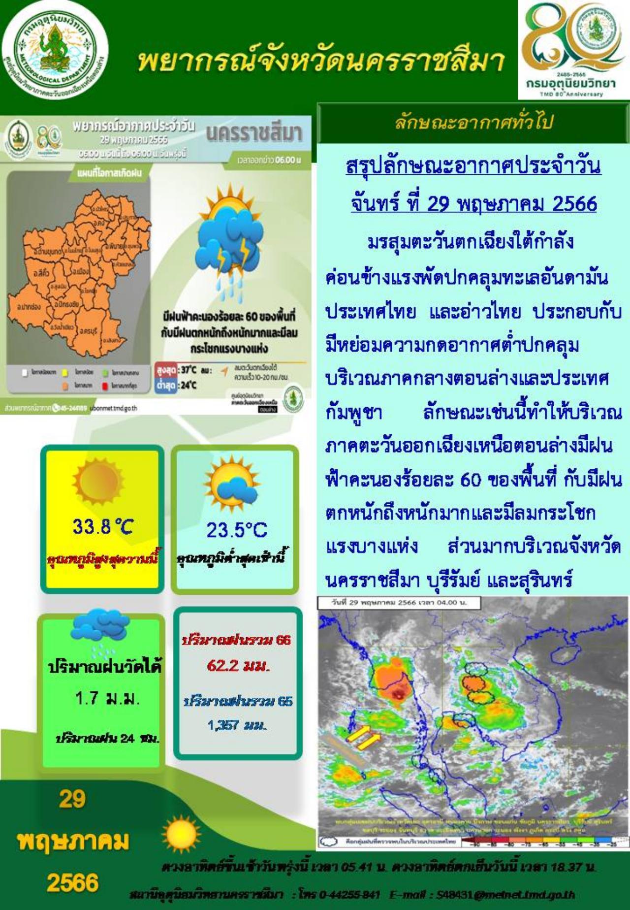ตามที่ศูนย์อุตุนิยมวิทยาภาคตะวันออกเฉียงเหนือตอนล่าง ได้พยากรณ์ลักษณะอากาศว่า จากอิทธิพลของมรสุมตะวันตกเฉียงใต้กำลังค่อนข้างแรงพัดปกคลุมทะเลอันดามัน ประเทศไทย และอ่าวไทย ประกอบกับมีหย่อมความกดอากาศต่ำปกคลุมบริเวณภาคกลางตอนล่างและประเทศกัมพูชา ทำให้บริเวณภาคตะวันออกเฉียงเหนือตอนล่างมีฝนฟ้าคะนองร้อยละ 60 ของพื้นที่ กับมีฝนตกหนักถึงหนักมาก และมีลมกระโชกแรงบางแห่ง ส่วนมากบริเวณจังหวัดนครราชสีมา บุรีรัมย์ และสุรินทร์ โดยลักษณะอากาศดังกล่าวทำให้จังหวัดนครราชสีมามีฝนตกหนักในหลายพื้นที่ ส่งผลดีต่อภาคการเกษตร โดยเฉพาะในพื้นที่ ตำบลท่าหลวง อำเภอพิมาย จังหวัดนครราชสีมา